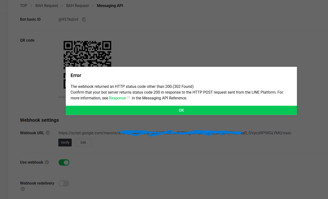 Google sheet ทำการเชื่อมต่อ Webhook settings ของ Line ไม่ได้ซักที ขอความช่วยเหลือหน่อยครับ