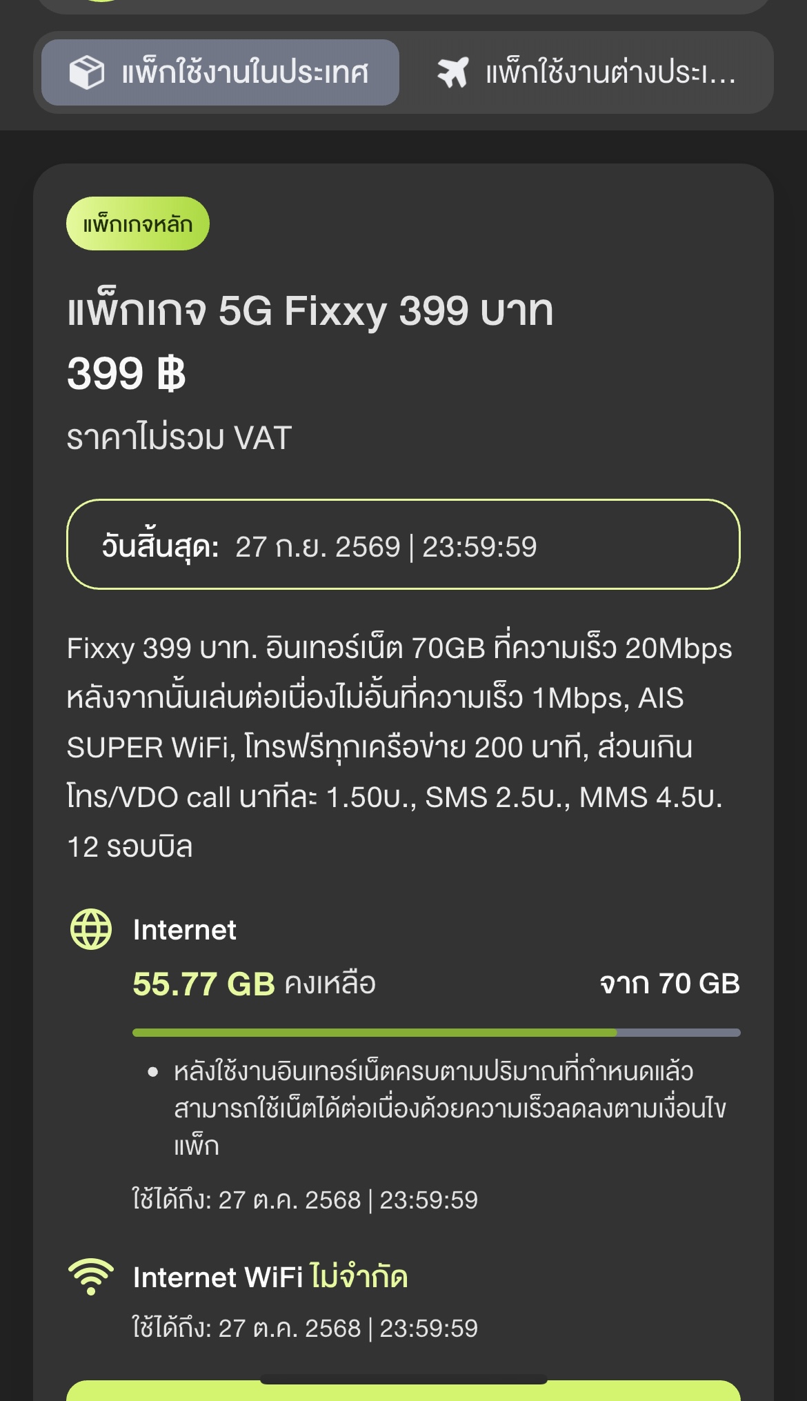 ผมได้สมัครแพ็กเกจเสริมนี้ เมื่อคืน เพราะแพ็คเกจเสริมอีกตัวหมด ผมเลยใช้ชั่วคราว แต่ตอนนี้ผมได้เติมเน็ตอีกแพ็คแล้วแต่ตอนที่ใช้งาน น่าจะใช้อันเก่า ที่ไม่ใช่เติมมา แอด Ais ช่วยดูหน่อยครับ