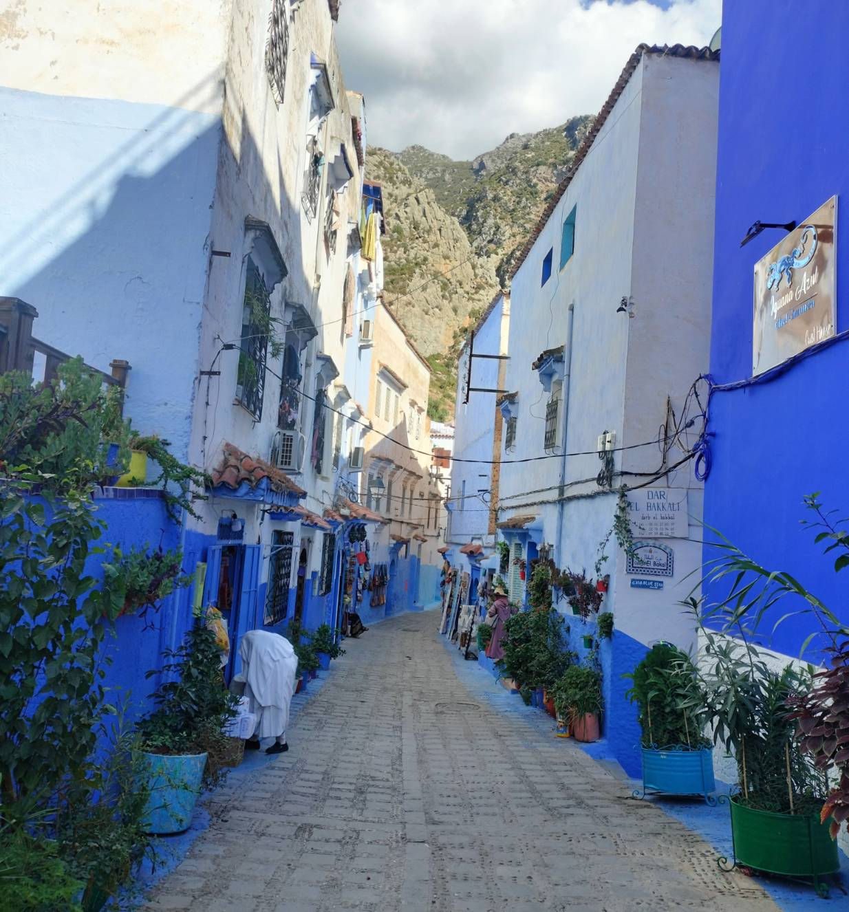 เดินทางมาถึงเมืองสีฟ้า คนน่ารักจากที่พักมายืนรอรับแล้วช่วยลากกระเป๋าขึ้นเนินลงเนินในเมืองเก่า