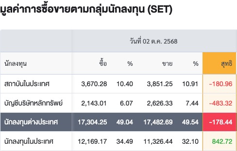 Sinthorn Summary 2/10/2568 : ต่างชาติขายสุทธิ -178.44 ลบ.