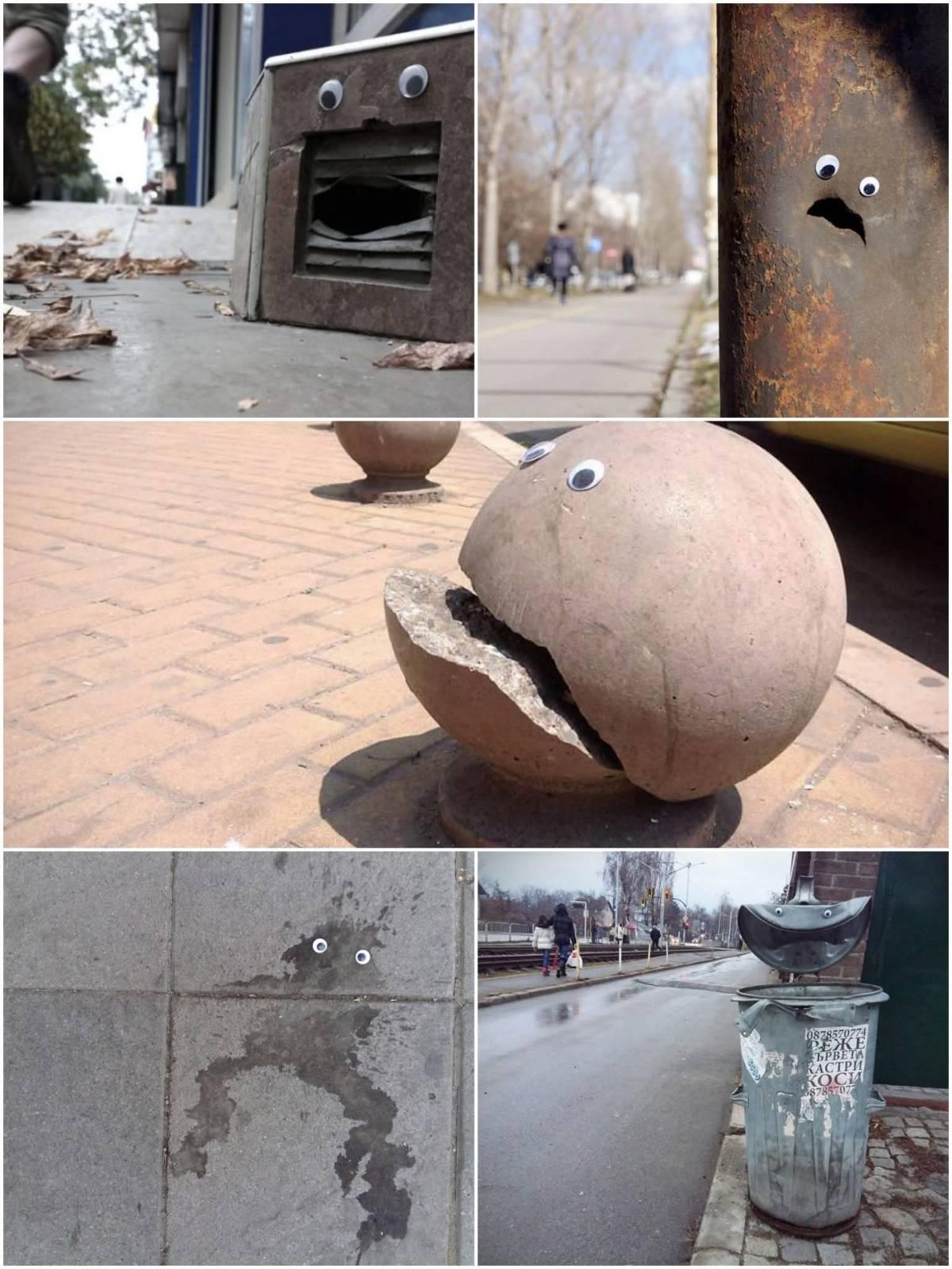 ศิลปินแนวสตรีทในประเทศบัลแกเรียที่ชื่อว่า Vanyu Krastev ได้สร้างผลงานโดยการติดตาปลอมลงบนต้นไม้ โคมไฟ ตู้ไปรษณีย์ ไปจนถึงบนถังขยะและคราบเลอะบนพื้น เพื่อพิสูจน์ว่าแม้แต่สิ่งที่ดูสกปรกที่สุด ก็ยังสามารถเป็นที่น่าสนใจมากขึ้นได้ ด้วยตาปลอมและจินตนาการเพียงเล็กน้อยเท่านั้น ซึ่งนอกจากจะสร้างความตลกขบขันและขจัดความเบื่อหน่ายในชีวิตประจำวันให้กับผู้ที่พบเห็นแล้ว ยังแฝงความรู้สึกที่ดีต่อสิ่งของต่างๆ เสมือนว่าสิ่งของเหล่านั้นก็มีชีวิตจิตใจเช่นกันอีกด้วย