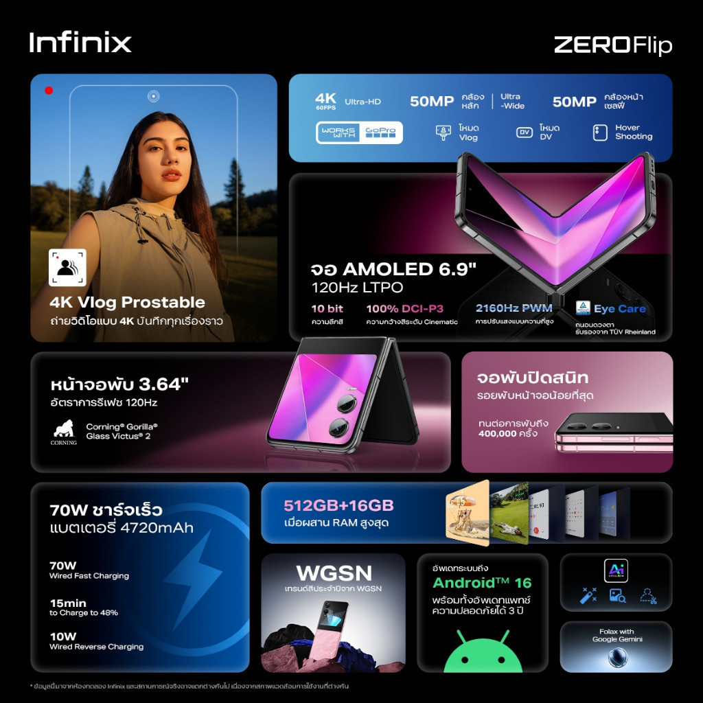 📱🎥 มือถือจอพับสายคอนเทนต์ Infinix ZERO Flip มือถือจอพับ วิดีโอ 4K เสถียร พับพกง่าย เหมาะเดินทาง 🎒⚡