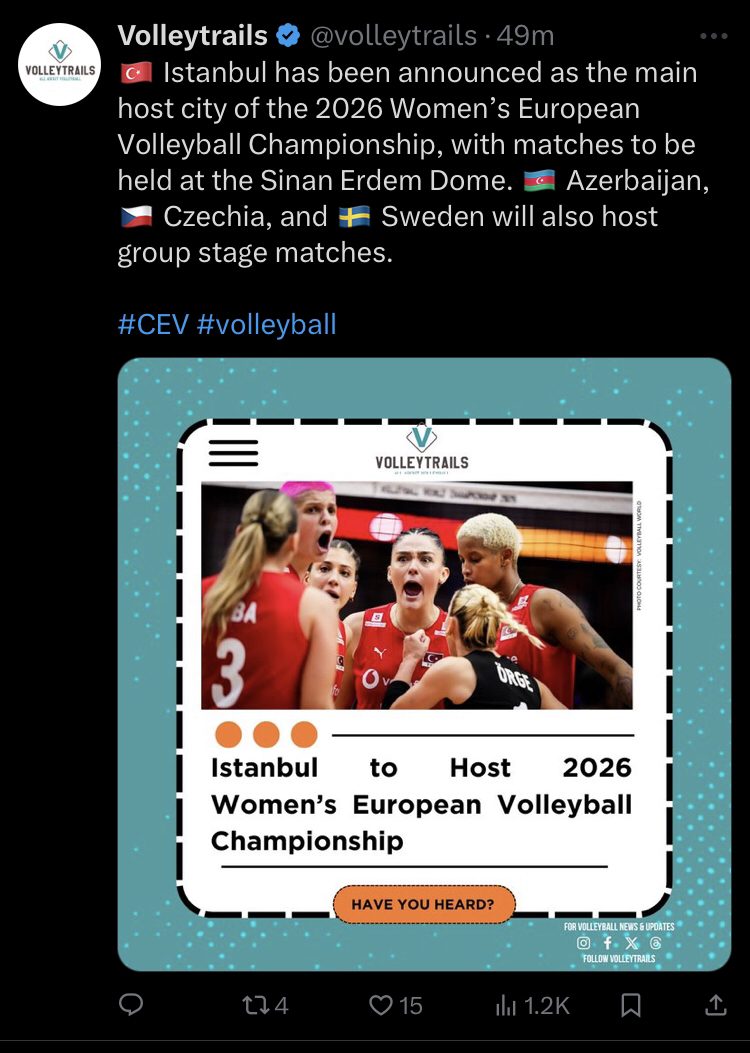ตุรีได้รับเลือกเป็นเจ้าภาพวอลเลย์บอลหญิงชิงแชมป์ยุโรปปี2026 มี2เมืองคือ อังการ่า กับ อิสตันบูล แต่ยังเลือกไม่ได้ว่าจะเอาเมืองไหน แต่ก็กำลังสร้างสนามใหม่ในอังการ่าคาดว่าน่าจะจุคนได้ 45,000-50,000 คน