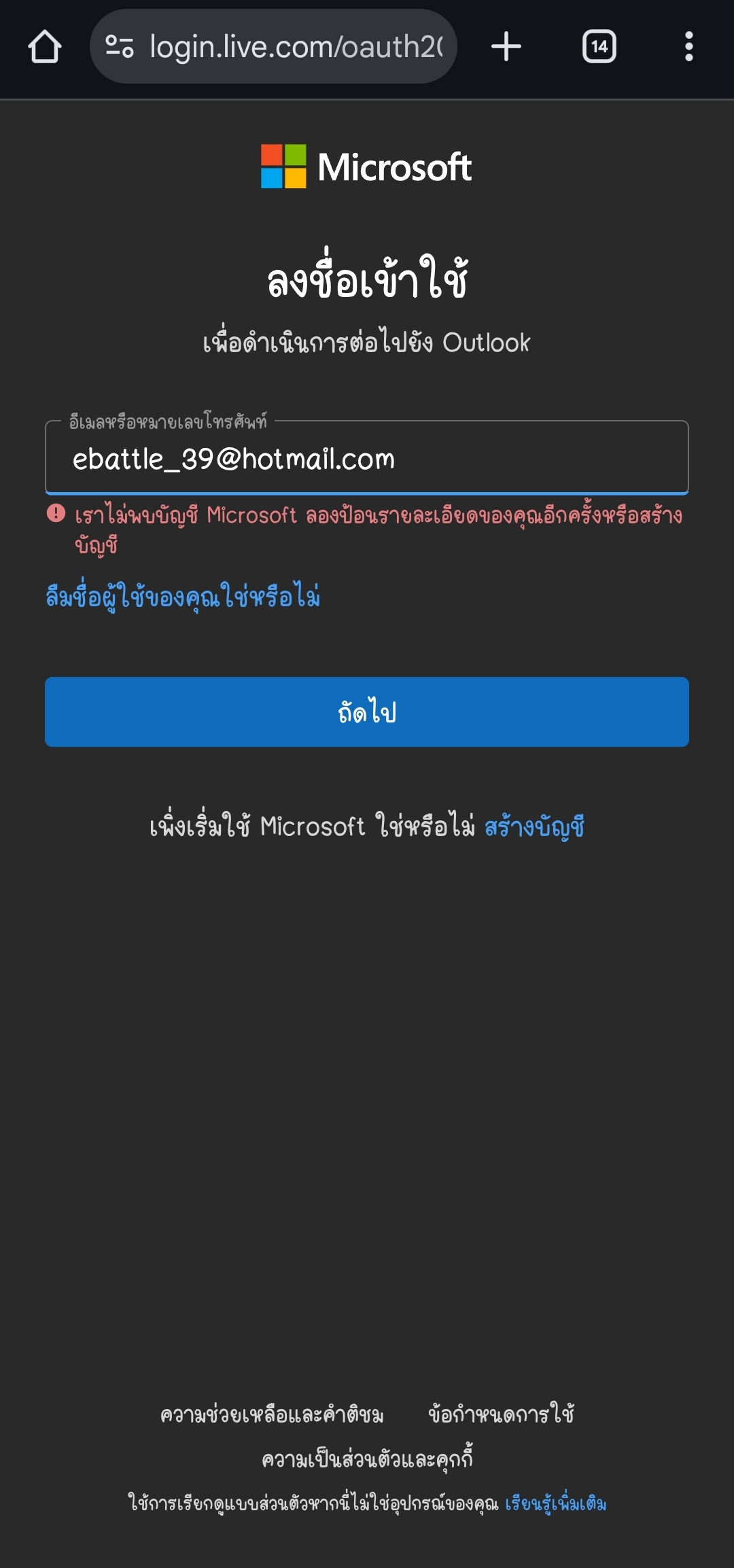 อีเมลที่ใช้เล่น facebook นำไป log in ใน outlook (hotmail) ไม่ได้ค่ะ พอนำอีเมลไปใส่ในช่อง log in ก็ขึ้นว่า ไม่มีบัญชี microsoft นี้ โปรดป้อนบัญชีอื่น คืออีเมลนี้ใช้สมัครทั้ง facebook และ ig ค่ะ แล้วต้