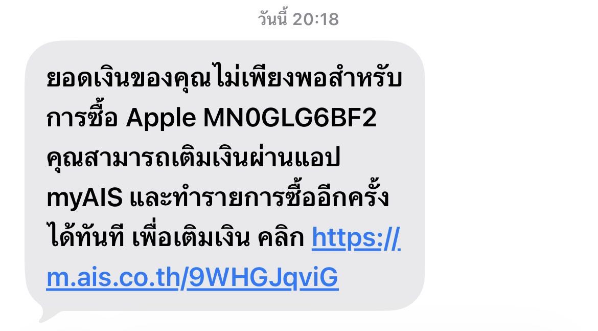 "ยอดเงินของคุณไม่เพียงพอสำหรับการซื้อ Apple MQKNS2B6TL คุณสามารถเติมเงินผ่านแอป myAIS และทำรายการซื้ออีกครั้งได้ทันที เพื่อเติมเงิน คลิก https://m.ais.co.t