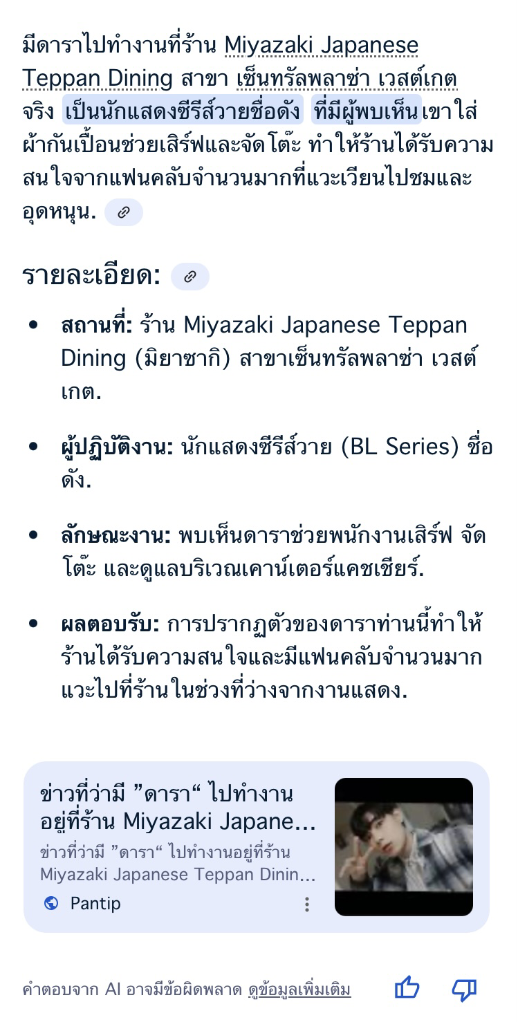 ข่าวที่ว่ามี "ดารา" ไปทำงานอยู่ที่ร้าน Miyazaki Japanese Teppan Dining (มิยาซากิ) สาขาเซ็นทรัลพลาซ่า เวสต์เกต ชั้น 3 นั้น เป็นเรื่องจริง และกำลังเป็นที่พูดถึงอย่างมากในโลกออนไลน์ครับ!