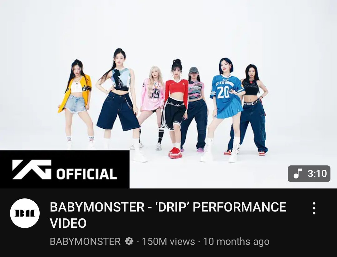 BABYMONSTER - ‘DRIP’ PERFORMANCE VIDEO มียอดวิวทะลุ 150 ล้านวิวเป็นที่เรียบร้อยแล้ว ดูแล้วตอนนี้น่าจะมีวงเคป๊อปเพียงแค่ 2 วง BLACKPINK และ BABYMONSTER อ้อลืมไปมีอีกวงหนึ่งคือ BTS
