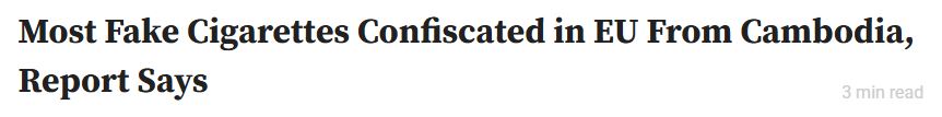 เกือบครึ่งหนึ่งของบุหรี่ปลอมที่ถูกยึดและเข้าสู่สหภาพยุโรปเมื่อปีที่แล้วมาจากกัมพูชา ทำให้กัมพูชากลายเป็นแหล่งบุหรี่ปลอมหลักของสหภาพยุโรป แซงหน้าจอร์เจียและจีน คณะกรรมาธิการยุโรปกล่าวในรายงานฉบับใหม่