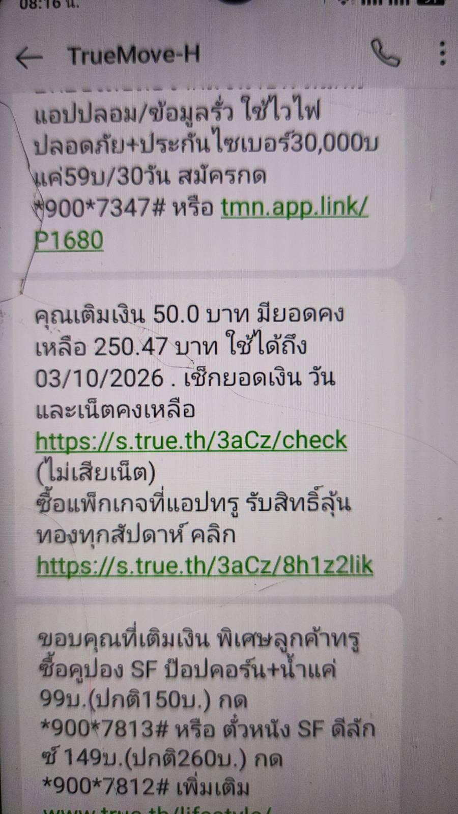 มีข้อความจาก true ให้เติมเงินเพื่อต่ออายุแพ็คเกจเน็ต อัตโนมัติ ในวันที่ 03/10/2568 ซึ่งเราใช้แพ็คเกจนี้มานานแล้ว ไม่เคยมีปัญหา แต่รอบนี้เมื่อถึงเวลามีข้อความแจ้งว่าไม่สามารถต่ออายุอัตโนมัติให้ได้เนื่อ