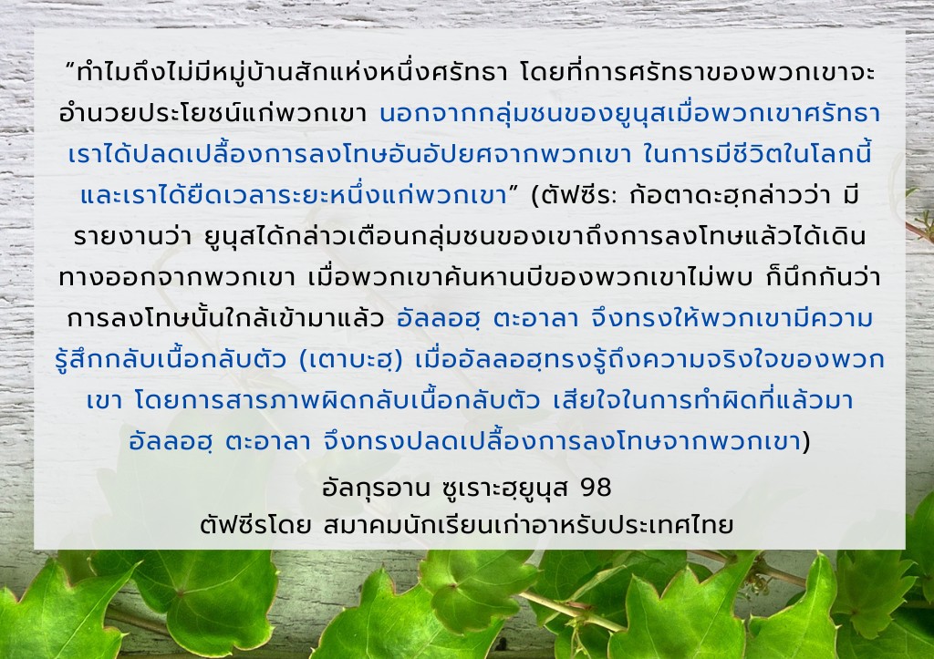 – “ทำไมถึงไม่มีหมู่บ้านสักแห่งหนึ่งศรัทธา โดยที่การศรัทธาของพวกเขาจะอำนวยประโยชน์แก่พวกเขา นอกจากกลุ่มชนของยูนุสเมื่อพวกเขาศรัทธา เราได้ปลดเปลื้องการลงโทษอันอัปยศจากพวกเขา ในการมีชีวิตในโลกนี้และเราได้ยืดเวลาระยะหนึ่งแก่พวกเขา” (ตัฟซีร: ก้อตาดะฮฺกล่าวว่า มีรายงานว่า ยูนุสได้กล่าวเตือนกลุ่มชนของเขาถึงการลงโทษแล้วได้เดินทางออกจากพวกเขา เมื่อพวกเขาค้นหานบีของพวกเขาไม่พบ ก็นึกกันว่า การลงโทษนั้นใกล้เข้ามาแล้ว อัลลอฮฺ ตะอาลา จึงทรงให้พวกเขามีความรู้สึกกลับเนื้อกลับตัว (เตาบะฮฺ) เมื่ออัลลอฮฺทรงรู้ถึงความจริงใจของพวกเขา โดยการสารภาพผิดกลับเนื้อกลับตัว เสียใจในการทำผิดที่แล้วมา อัลลอฮฺ ตะอาลา จึงทรงปลดเปลื้องการลงโทษจากพวกเขา) (อัลกุรอาน ซูเราะฮฺยูนุส 98 ตัฟซีรโดย สมาคมนักเรียนเก่าอาหรับประเทศไทย)