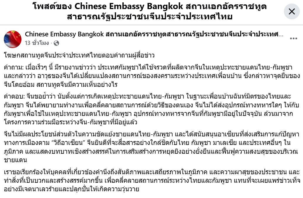 โพสต์ของ Chinese Embassy Bangkok ; จีนไม่ได้ส่งอุปกรณ์ทางทหารใดๆ ให้กับกัมพูชาเพื่อใช้ในเหตุปะทะชายแดนไทย-กัมพูชา