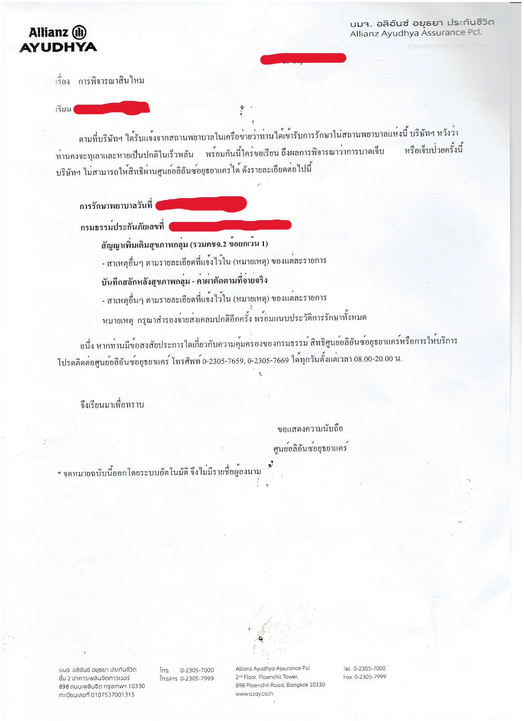 - รอบ2 เราไปโรงพยาบาลของรัฐ ก็ไปทำการตรวจอะไรเสร็จเรียบร้อยและจะทำการผ่าตัด เราก็ได้โทรไปถามประกันว่าเราจะนอนห้องพิเศษแล้วเบิกค่าประกันได้ไหม ทางประกันก็ตอบมาเหมือนเดิมต้องให้ทางโรงพยาบาลเขาเป็นคนยื่นเรื่องมา พอเราได้ทำการเข้าไปรักษาและผ่าตัดและได้ทำการนอนห้องพิเศษ วันที่เราจะออกเราก็แจ้งให้โรงพยาบาลทำเรื่องยื่นเรื่องไปหากับทางประกัน อลิอันซ์ อยุธยา ในทางโรงพยาบาลก็ได้ทำการยื่นเรื่องไปแต่สรุปสุดท้ายประกัน อลิอันซ์ อยุธยา เป็นการตอบจดหมายแบบอัตโนมัติกลับมา ไม่มีการพิจารณาหรือการเซ็นใดๆทั้งสิ้นคือ บริษัทประกันอลิอันซ์ อยุธยานี้แย่มากๆจะเสนอไม่ให้บริษัททำประกันกับบริษัทอลิอันซ์ อยุธยานี้ และใครที่จะทำประกันบริษัทอลิอันซ์ อยุธยานี้ขอให้คิดดีๆและดูเคสนี้เป็นตัวอย่าง