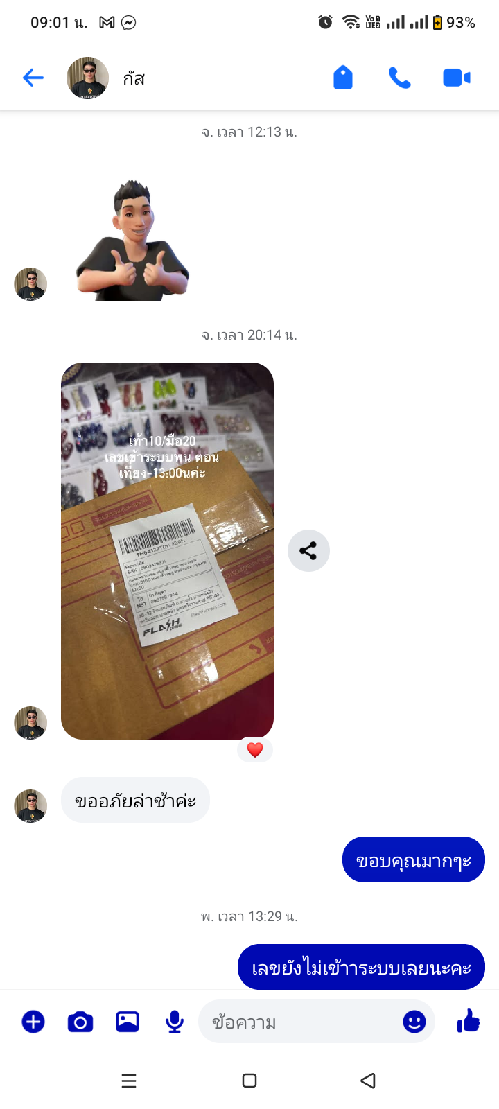 สวัสดีค่ะ admin พอดีสั่งของกับทางเพจไว้แล้วก็ทางเพจได้แจ้งเป็นพัสดุมามีใบปะหน้ากล่อง และได้แจ้งว่าเลขพัสดุจะเข้าระบบภายในวันพรุ่งนี้ก็คือภายในวันอังคาร ที่ 30 กันยายน 2568 จนตอนนี้วันศุกร์ที่ 3 ตุลาคม 2568 เลขยังไม่เข้าระบบ แจ้งทางร้านไปตลอดค่ะในระหว่างนั้นทางร้านแจ้งว่าได้ส่งของไปแล้วให้ดูเลขในระบบได้เลยแต่ก็ได้แจ้งไปว่าเลขยังไม่เข้าระบบเลยค่ะรบกวนทางร้านช่วยดูให้หน่อย ทางนี้คิดว่าพัสดุอาจจะตกหล่นที่สาขาหรือไม่ อยากให้ทางขนส่งแฟกซ์ช่วยติดตามให้หน่อยได้ไหมคะ