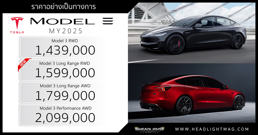 ราคาอย่างเป็นทางการ Tesla Model 3 (MY2025) : 1,439,000 – 2,099,000 บาท | เพิ่มกล้องหน้า, ก้านไฟเลี้ยว วิ่งไกล 750 km. (W