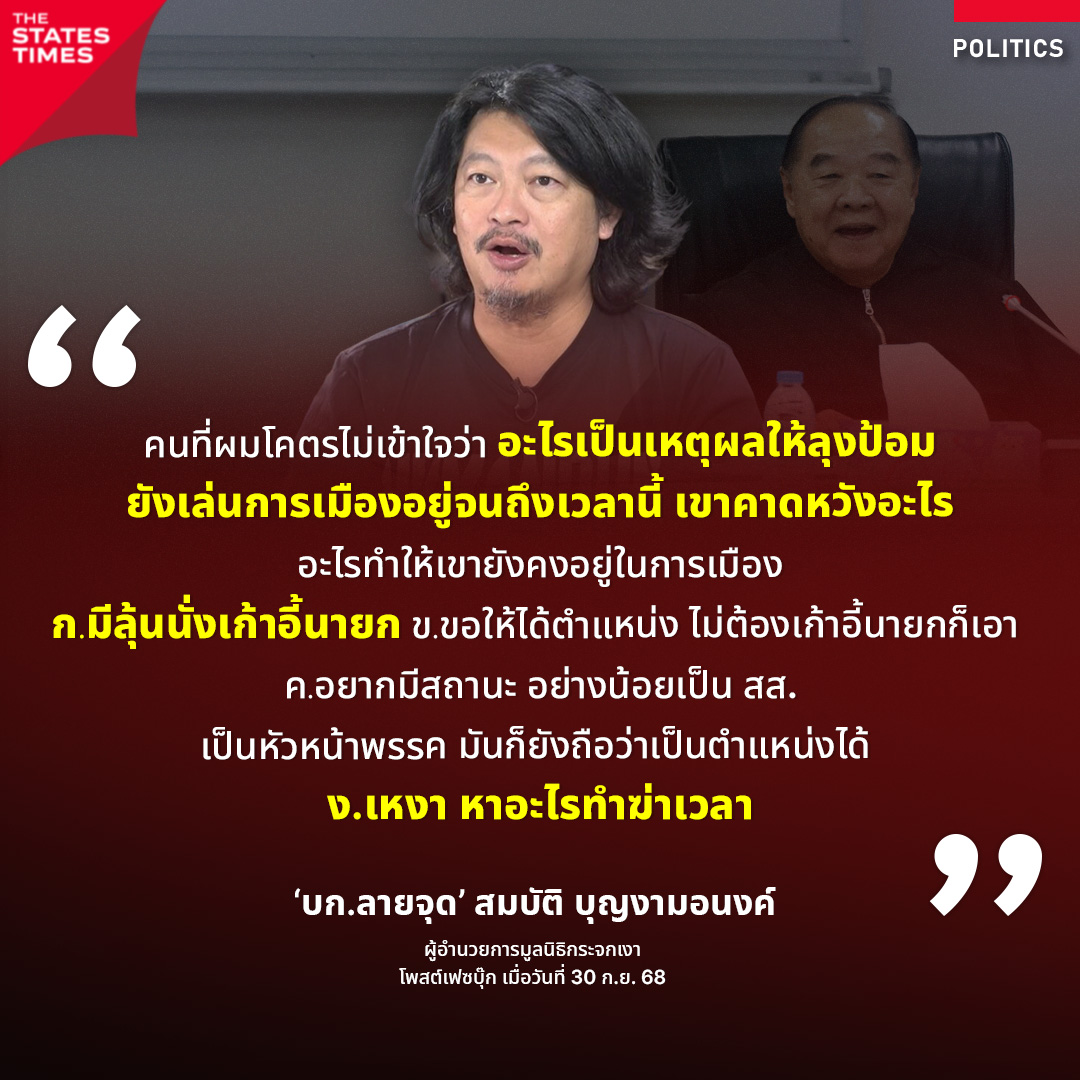 ลุงตู่วางมือจากการเมืองไปเลี้ยงหลานแล้ว แต่มีข่าวลือว่าไปอยู่เบื้องหลัง ก็ไม่รู้ว่ายังไงเหมือนกัน ลุงป้อมมีกระแสข่าวว่าจะลงนายกรัฐมนตรีในสมัยถัดไป ไม่ว่าสุขภาพจะเป็นยังไงก็ตาม ไม่แน่ใจว่าเสื้อเหลืองจะ