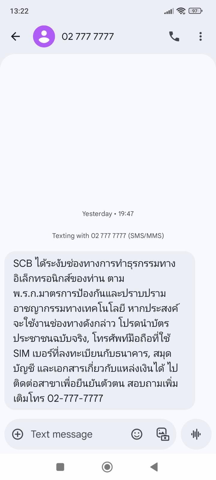 แชร์ประสบการณ์ "SCB ได้ระงับช่องทางการทำธุรกรรมทางอิเล็กทรอนิกส์ของท่าน ตาม พ.ร.ก.มาตรการป้องกันและปราบปรามอาชญากรรม.."