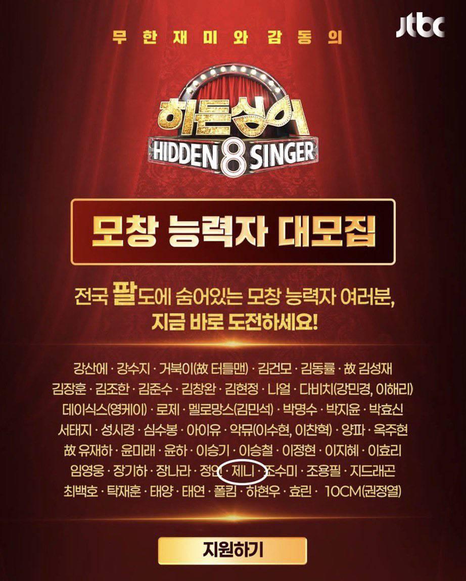 JTBC ประกาศทำรายการ Hidden Singer ซีชั่น 8 เริ่มเปิดรับสมัครนักร้องที่มีความสามารถเลียนแบบเสียงของเจนนี่ได้ และถ้าหากมี เจนนี่อาจจะไปปรากฏตัวในรายการในฐานะศิลปินตัวจริง