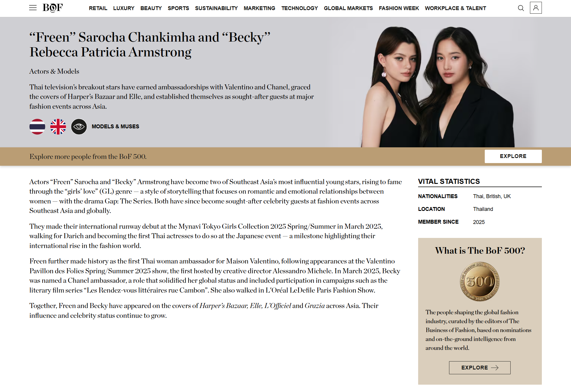 นักแสดง “ฟรีน” สโรชา และ “เบ็คกี้” อาร์มสตรอง กลายเป็นสองดาราสาวผู้ทรงอิทธิพลที่สุดแห่งเอเชียตะวันออกเฉียงใต้ โด่งดังจากซีรีส์แนว “Girls’ Love” (GL) ซึ่งเป็นรูปแบบการเล่าเรื่องที่เน้นความสัมพันธ์โรแมนติกและอารมณ์ระหว่างผู้หญิง ผ่านซีรีส์เรื่อง Gap: The Series ต่อมาทั้งคู่กลายเป็นแขกรับเชิญคนดังที่เป็นที่ต้องการตัวในงานแฟชั่นทั่วเอเชียตะวันออกเฉียงใต้และทั่วโลก