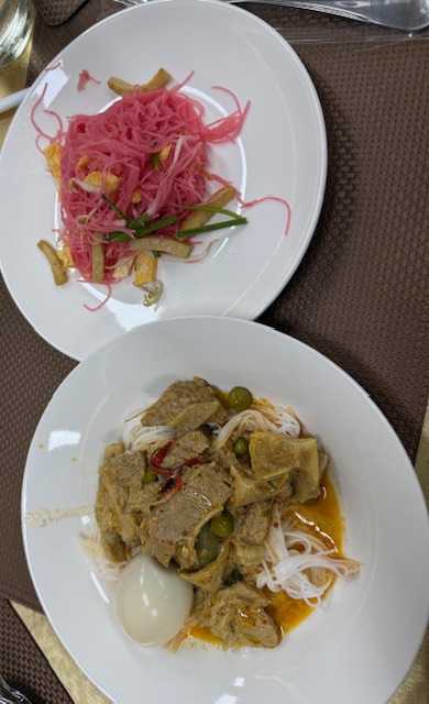 มีขนมจีนแกงเขียวหวานเนื้อและไก่ จัดเขียวหวานเนื้อมา 1 จาน กับผัดหมี่ชมพูอีก 1 จาน ต่อท้ายด้วย