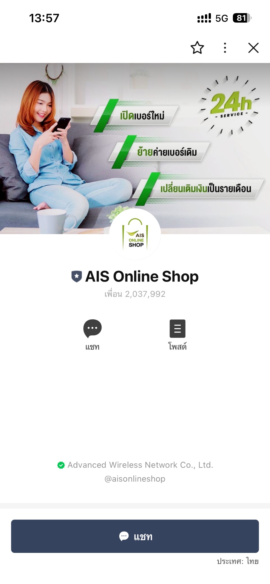 ขออนุญาตสอบถามค่ะ พอดีว่าได้แอดไลน์เปลี่ยนจากเติมเงินเป็นรายเดือน จาก บัญชี ais online shop ดังรูป อยากทราบว่าเป็นบัญชีปลอมหรือมิจฉาชีพคะ พอดีว่าทำรายการไปเรียบร้อยแล้วแต่เพิ่งมเอะใจ