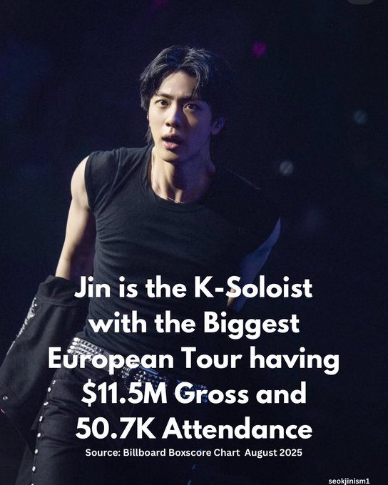BTS Jin เป็นศิลปินเดี่ยว K-Pop ที่มียอดทัวร์คอนเสิร์ตในยุโรปสูงที่สุดมีรายได้รวม $11.5M ยอดผู้เข้าชม 50,700 คนจาก 4 รอบ