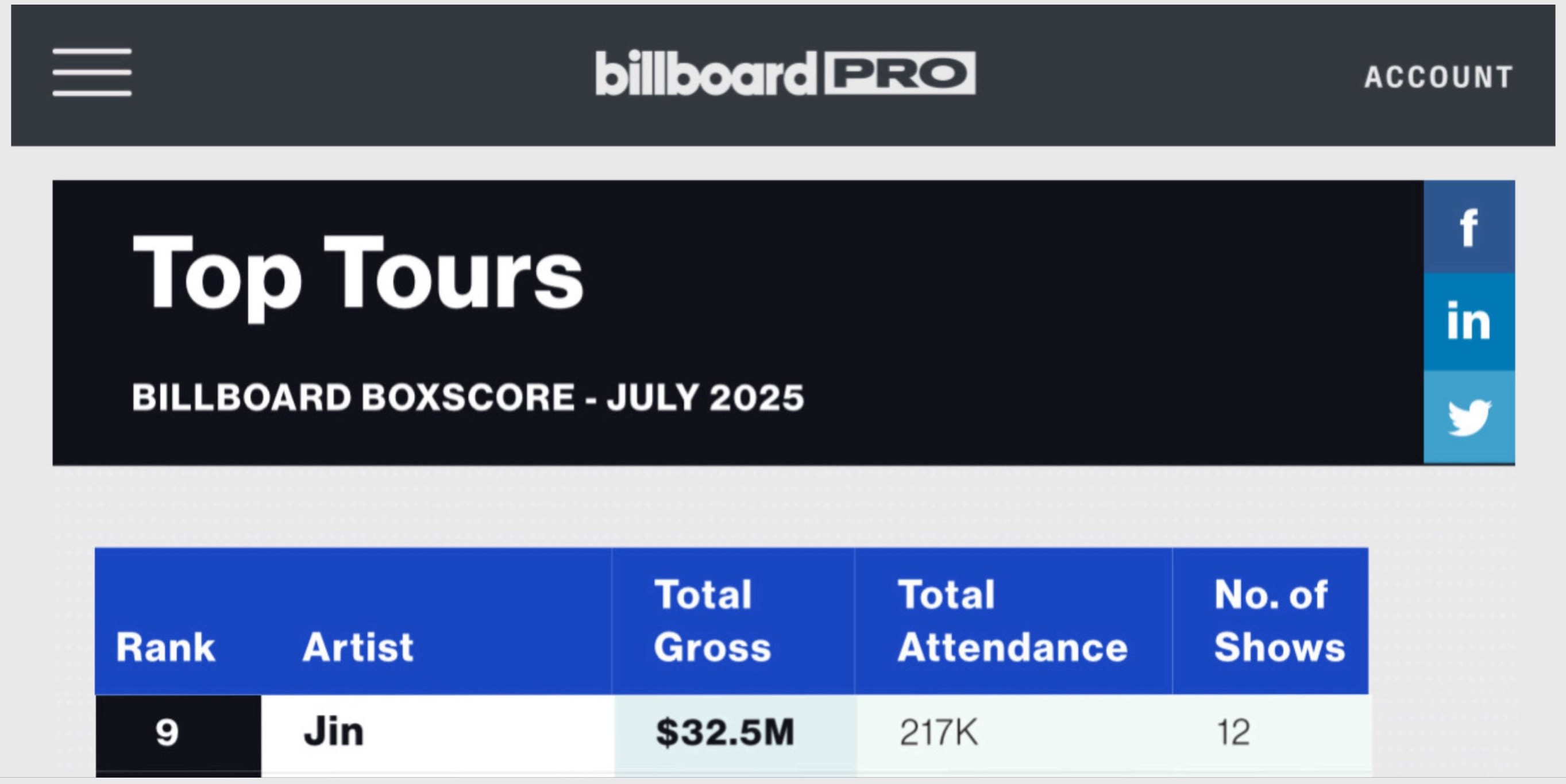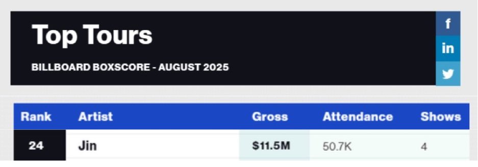 Billboard's Boxscore ประจำเดือนสิงหาคม 2025 ทัวร์คอนเสิร์ตเดี่ยวของจินในชื่อ