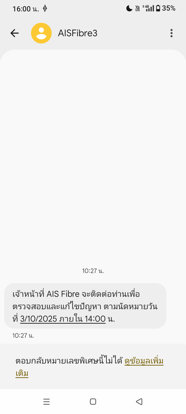 คืองี้ครับ ผมไม่ได้จ่าย ค่าเน็ต นาน5เดือน เพราะ ผมไปฝึกงานที่ กทม. พอกลับมา ไปจ่ายตัง ครบหมด ทุกบาท ไม่เหลือค้างชำระ เเต่ยังใช้เน็ตไม่ได้ พอไปแจ้ง ที่บิ๊กซีเขาบอกว่า ปล่อยสัญญาณให้เเล้ว ผมจ่ายตังไป 2วันเเล้วครับ แต่ก็ยังใช้ไม่ได้ วันนี้03/10/68 ได้ไปแต้งอีกครั้ง เขาบอก ว่าเเจ้ง ทางศูนย์ให้เเล้ว จะติดต่อมาสอบถามเเละลงพื้นที่มาเเก้ให้ ภายใน 14:00 เเต่ถึงตอนนี้ 16:14 03/10/68ยัง ไม่มีการ โต้ตอบใดๆ ตามรูปเลยครับ