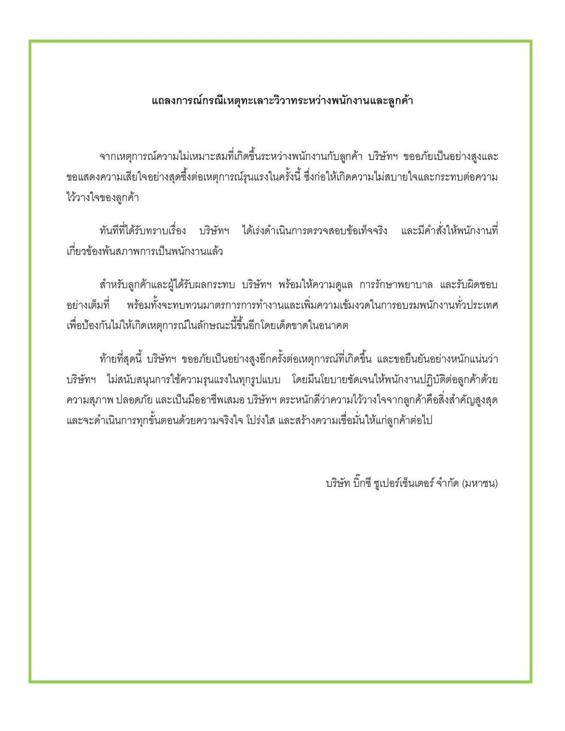 ท้ายที่สุดนี้ บริษัทฯ ขออภัยเป็นอย่างสูงอีกครั้งต่อเหตุการณ์ที่เกิดขึ้น และขอยืนยันอย่างหนักแน่นว่าบริษัทฯ ไม่สนับสนุนการใช้ความรุนแรงในทุกรูปแบบ โดยมีนโยบายชัดเจนให้พนักงานปฏิบัติต่อลูกค้าด้วยความสุภาพ ปลอดภัย และเป็นมืออาชีพเสมอ บริษัทฯ ตระหนักดีว่าความไว้วางใจจากลูกค้าคือสิ่งสำคัญสูงสุดและจะดำเนินการทุกขั้นตอนด้วยความจริงใจ โปร่งใส และสร้างความเชื่อมั่นให้แก่ลูกค้าต่อไป