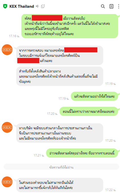 - ส่งจากสมุทรปราการมากรุงเทพ สินค้าติดอยู่คลังบางพลัดเป็นเวลา 7 วันแล้ว ไม่ขยับใดๆ - ติดต่อแชท Kerry ไปแล้ว จี้ถามแบบทุกวัน ได้คำตอบเดิมคือ เร่งการจัดส่งให้แล้ว - บอก Admin Kerry ขอเบอร์ที่คลัง