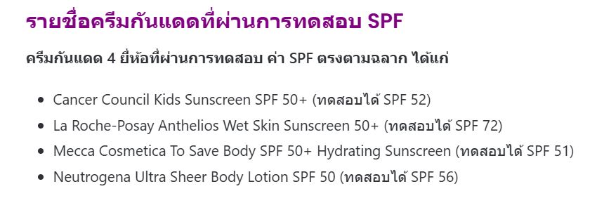 "ครีมกันแดด" ที่ผ่านการทดสอบและมีค่า SPF ตรงตามที่ระบุไว้