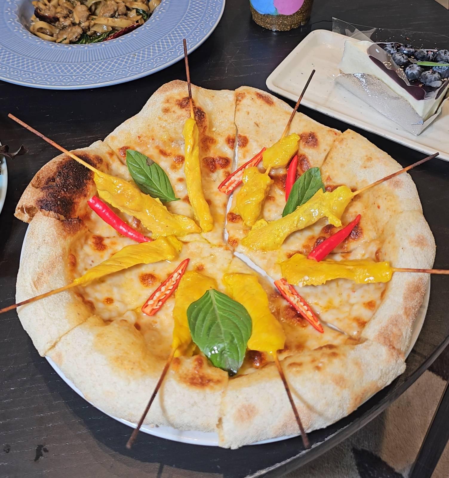 โชคดีที่พิซซ่าของร้านนี้ เป็นแป้งคราฟ ที่ใช้เวลาหมัก และอบใหม่ ๆ ทุกถาด เลยทำให้โจทย์ง่ายขึ้นจากแป้งที่สดมาก พอใส่น้ำจิ้มหมูสะเต๊ะ ที่ดัดแปลงมาเป็นซอสของพิซซ่า มีรสแกง และถั่วที่คุ้นเคย เลยทำให้โจทย์ข้อนี้ ผ่านฉลุย