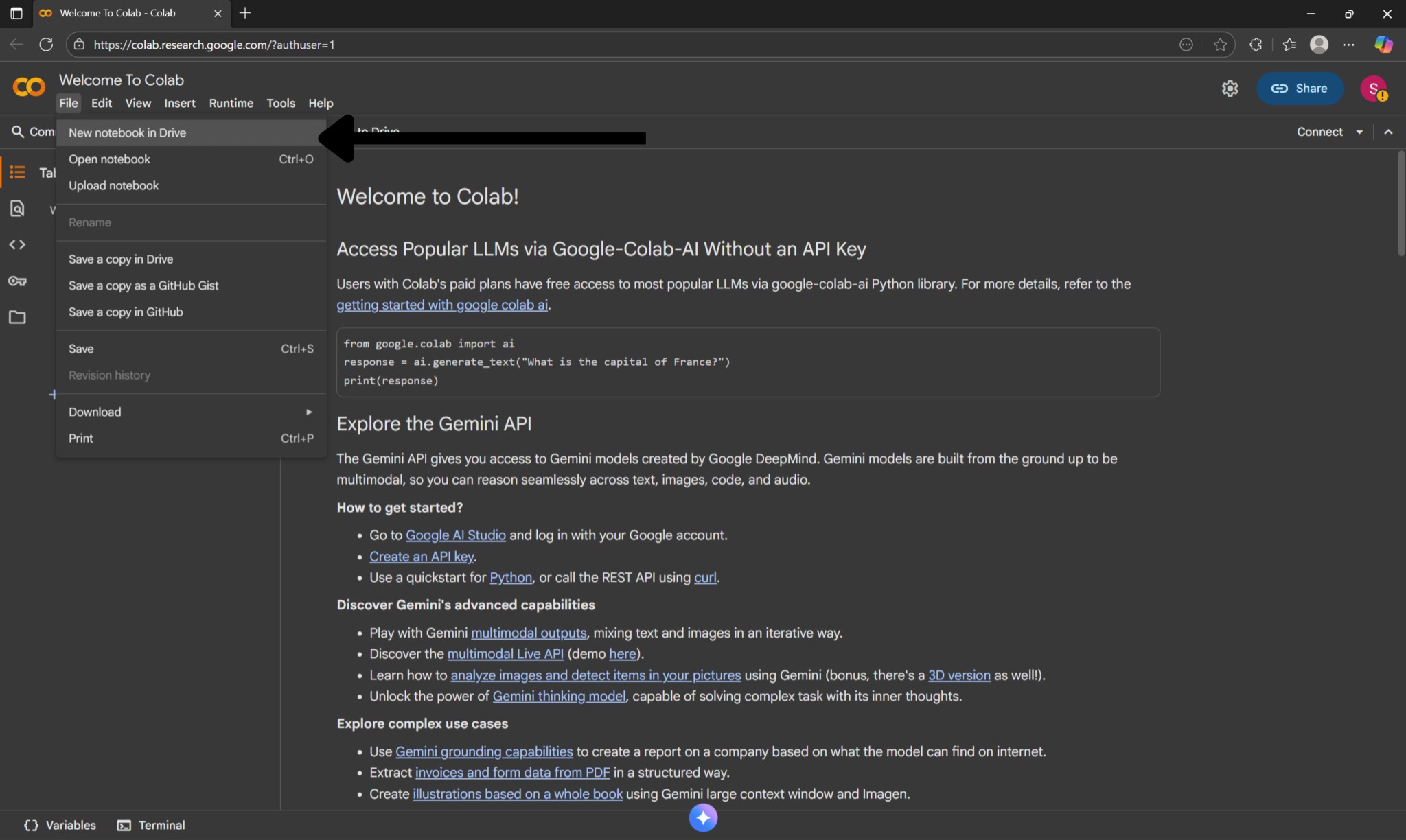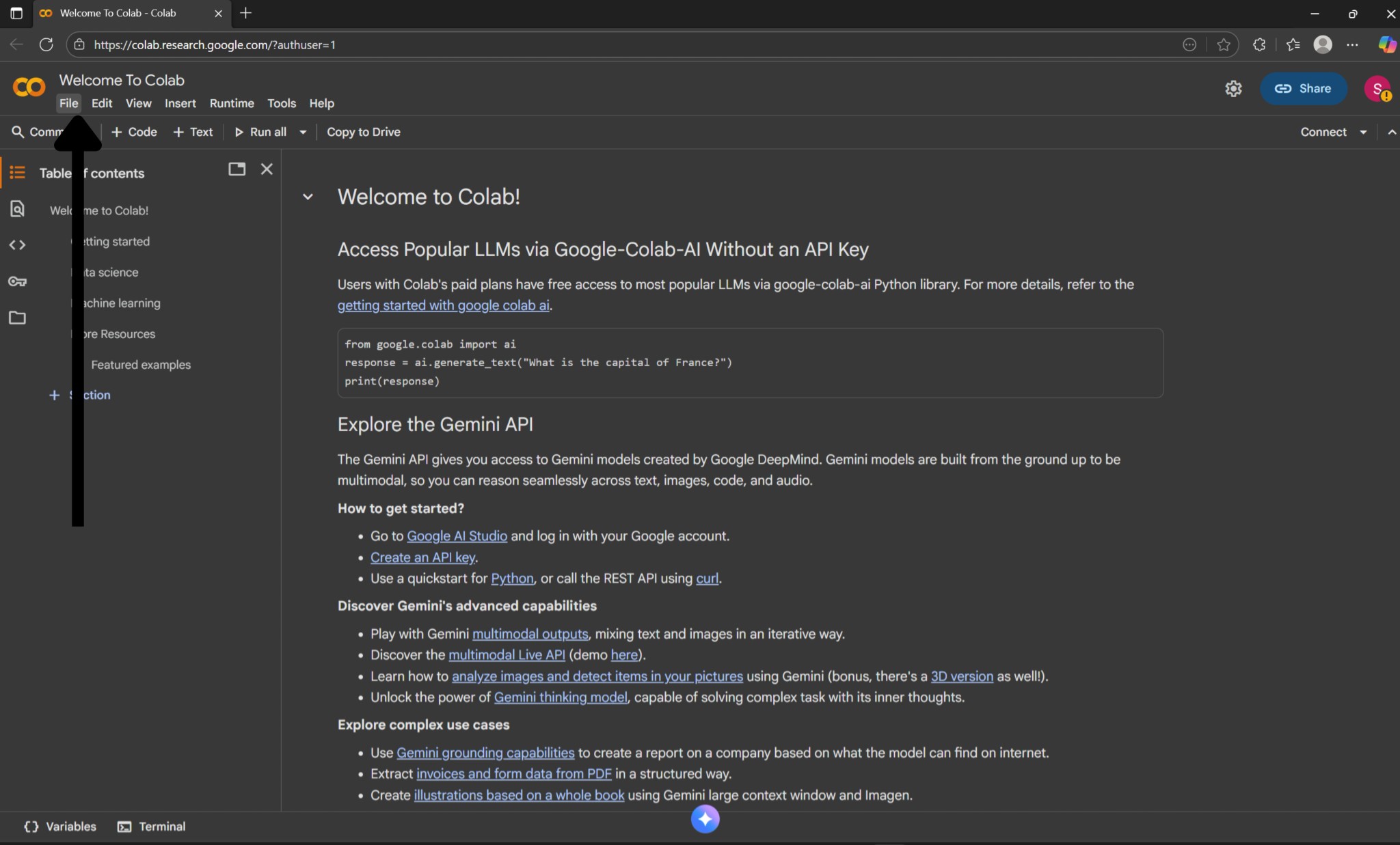 ให้เข้ามาที่ Google Colab หลังจากที่เข้ามาใน Google Colab แล้ว ให้คลิกที่ File ที่อยู่มุมซ้ายบนครับ