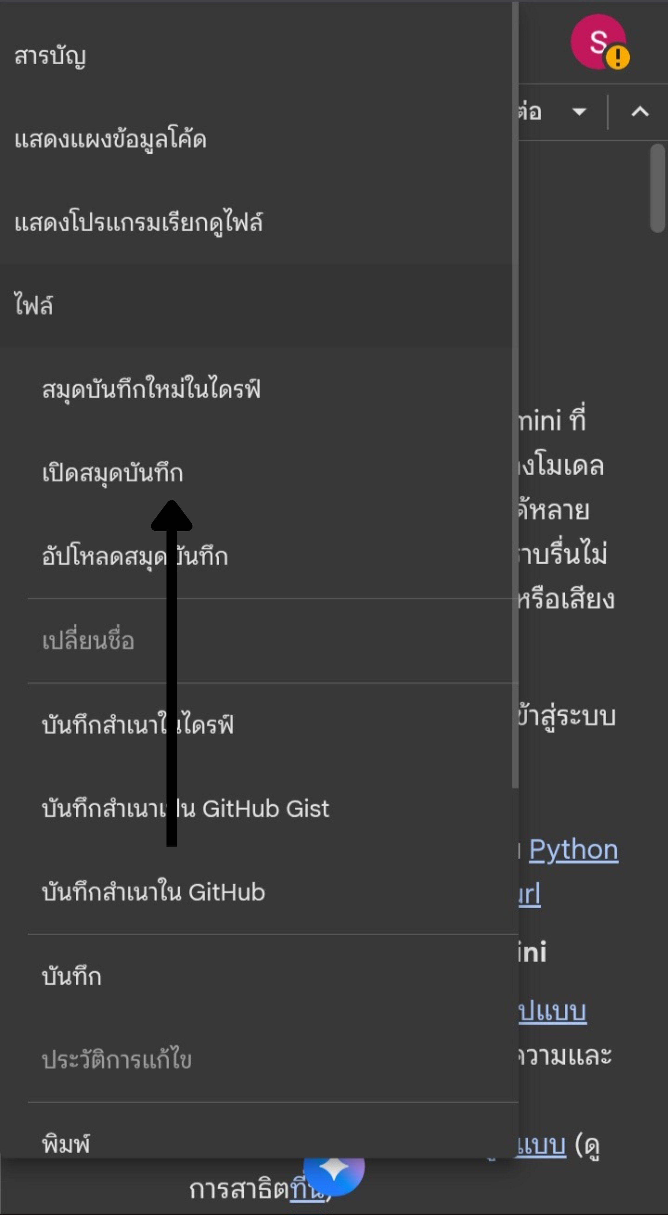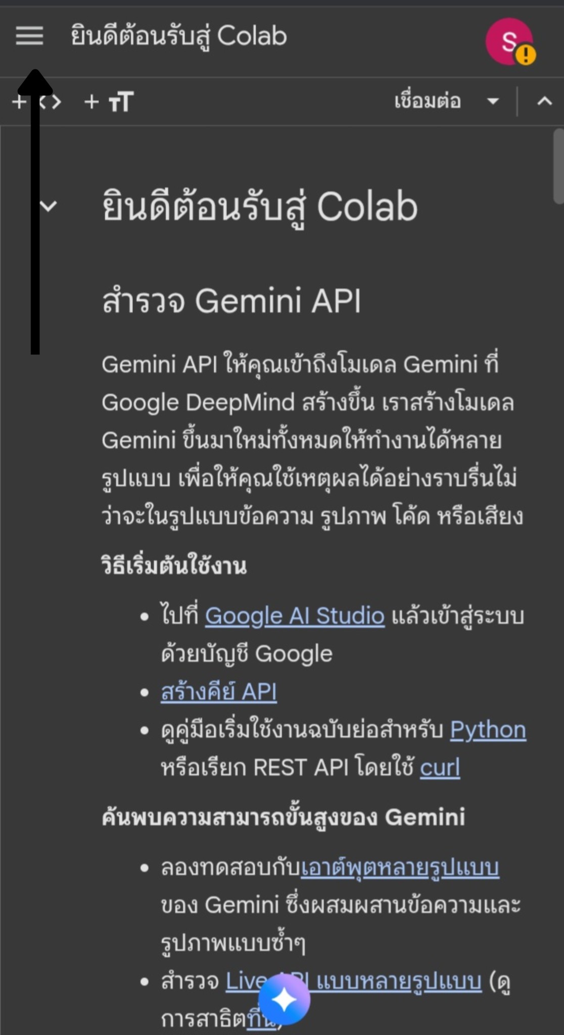 Google Colab แล้ว ให้คลิกที่ไอคอนขีด 3 ขีดที่อยู่มุมซ้ายบนครับ