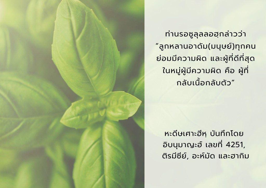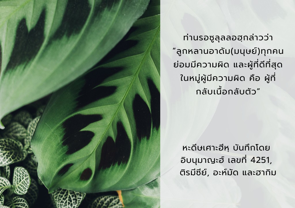 – ท่านรอซูลุลลอฮฺกล่าวว่า “ลูกหลานอาดัม(มนุษย์)ทุกคน ย่อมมีความผิด และผู้ที่ดีที่สุดในหมู่ผู้มีความผิด คือ ผู้ที่กลับเนื้อกลับตัว” (หะดีษเศาะฮีหฺ บันทึกโดย อิบนุมาญะฮ์ เลขที่ 4251, ติรมีซีย์, อะห์มัด และฮากิม)