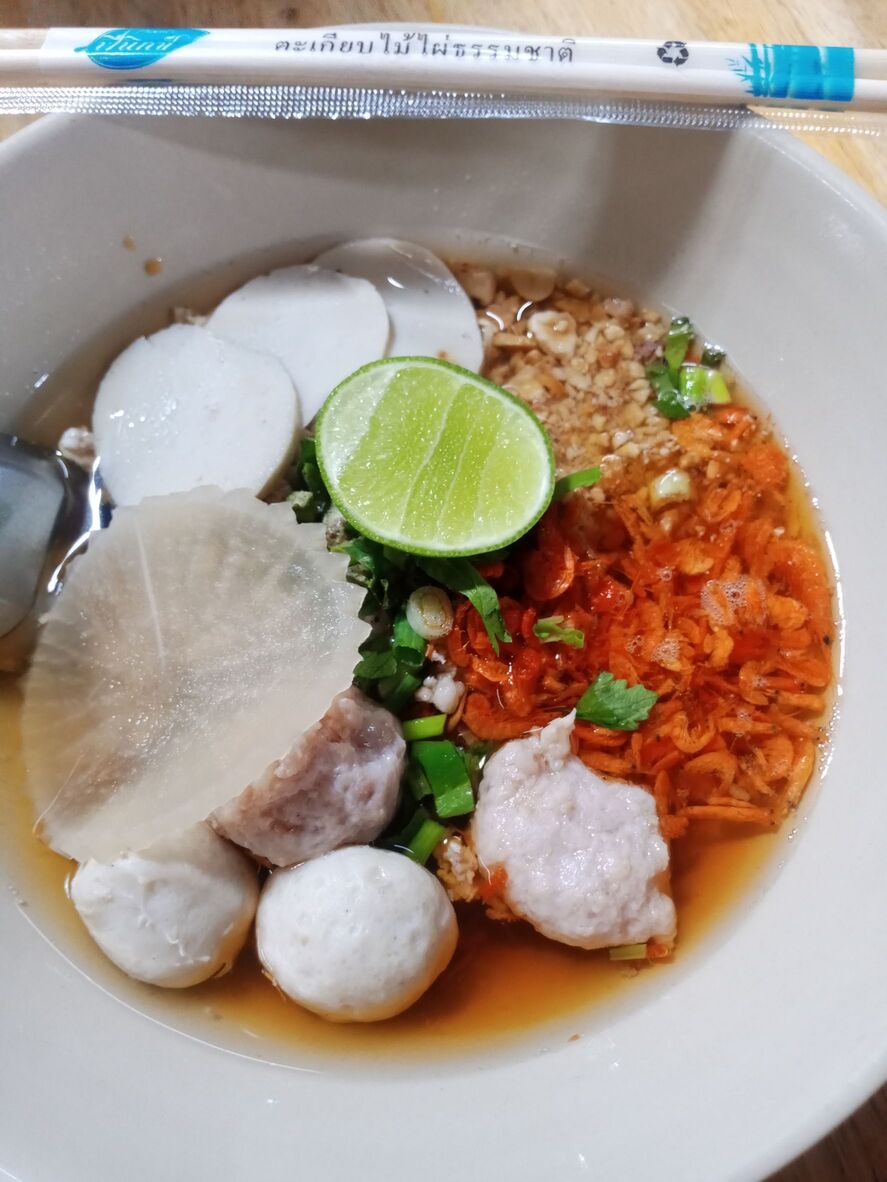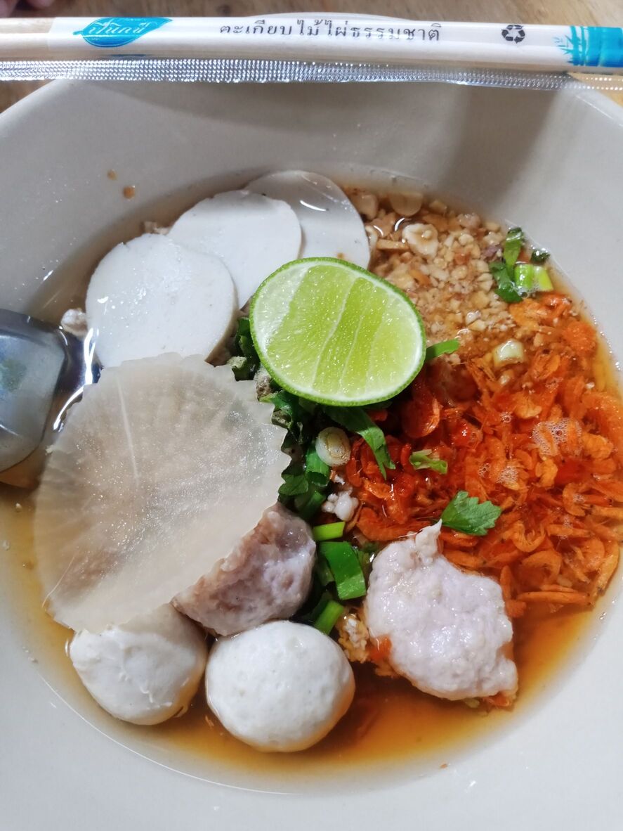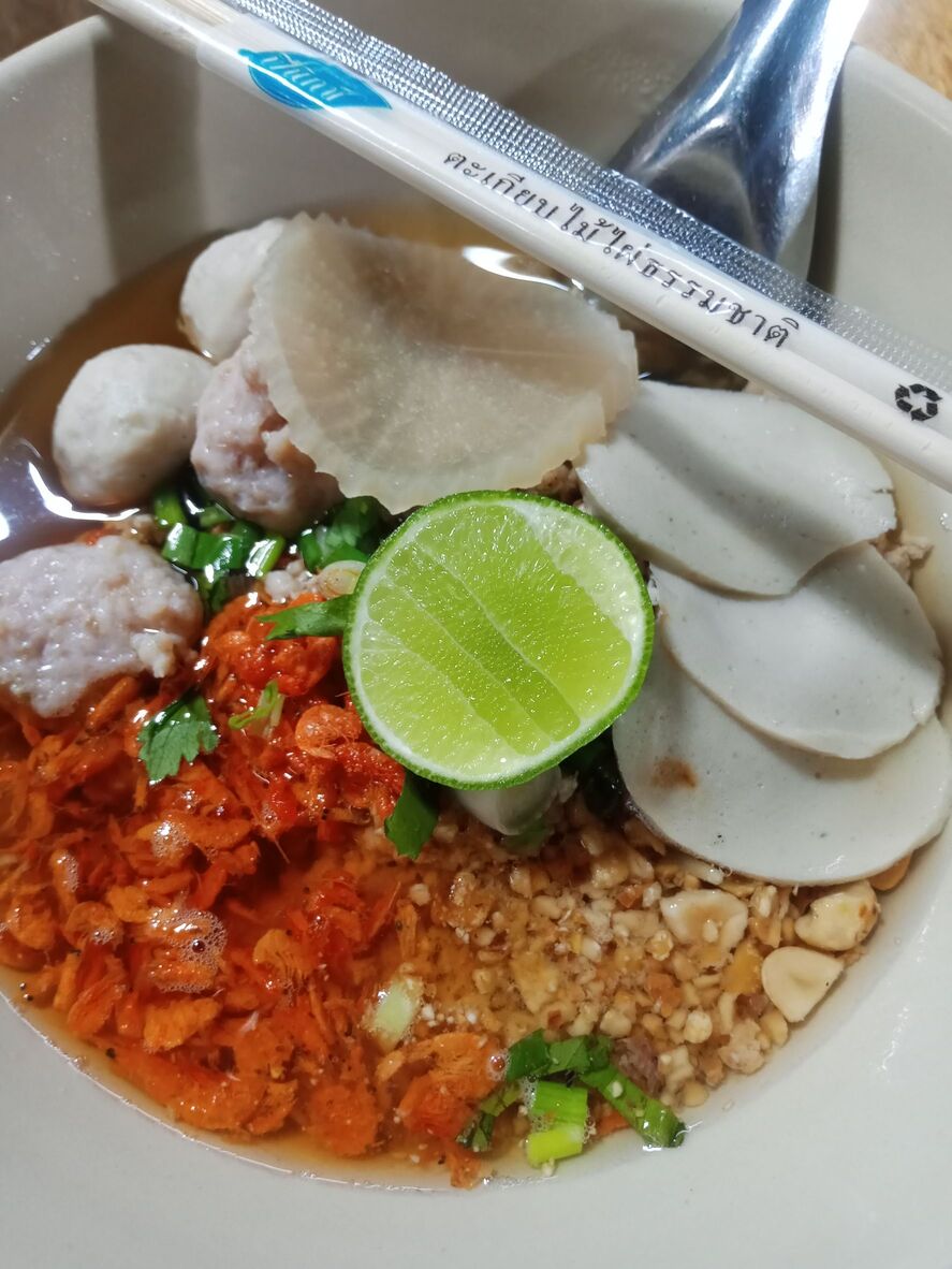 ก๋วยเตี๋ยวเจ๊บ๊วย ร้านเด็ดจากชุมแสง ก๋วยเตี๋ยวต้มยำหมูกรอบ หมูแดง ลูกชิ้น รุ่นพี่ของคุณภรรยาเอามาฝากผมและคุณภรรยาฮะ มีมะนาวฝาน วางมาในถ้วยด้วย ลูกชิ้นปลากราย และ หมูกรอบ กินด้วยกันคือเข้าที เป็นก๋ว