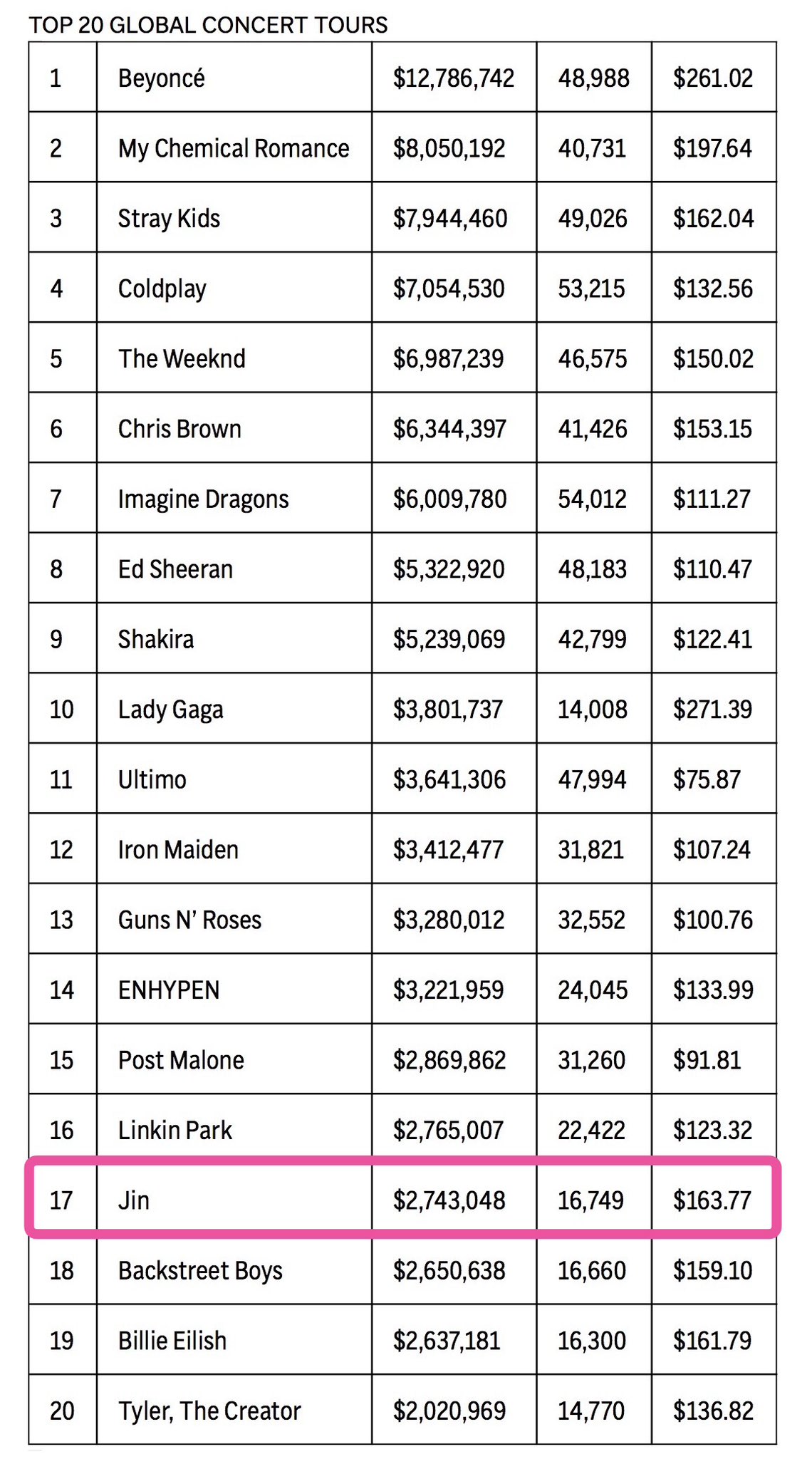 จิน จากวง BTS ติดอันดับที่ 17 ด้วยทัวร์ RUNSEOKJIN_ epTOUR ซึ่งทำรายได้เฉลี่ยต่อเมืองอยู่ที่ 2.74 ล้านดอลลาร์สหรัฐ ($2,743,048) และเป็นศิลปินเดี่ยวเคป็อปคนเดียวใน 20 อันดับแรกนี้