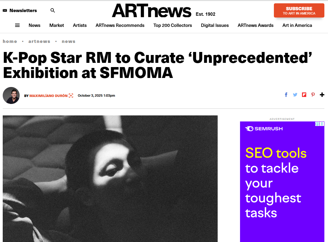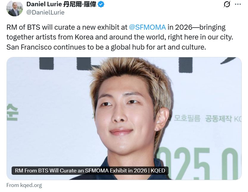 KQED สำนักข่าวทีวีในซานฟรานซิสโกได้รายงานข่าวว่า RM แห่งวง BTS จะเป็นผู้จัดงานนิทรรศการที่ SFMOMA ในปี 2026