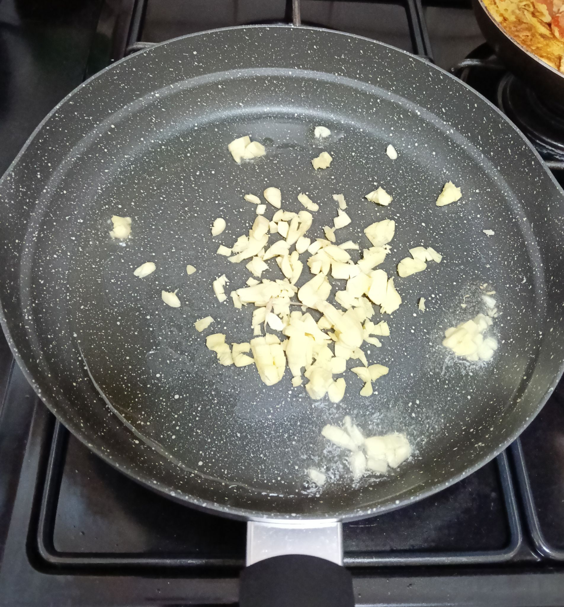 ตั้งกระทะให้ร้อน ใส่น้ำมัน ใส่กระเทียมสับลงไปผัดให้หอม