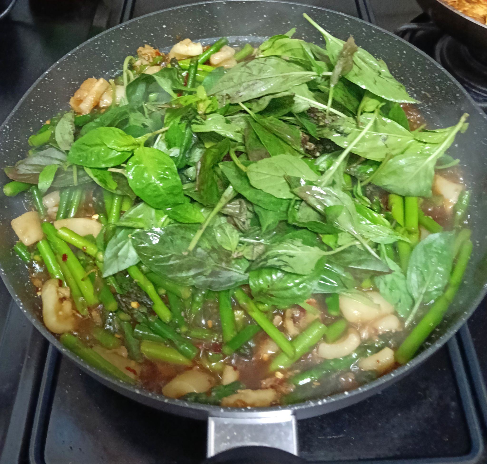 ผัดทุกอย่างให้เข้ากัน ชิมดูรสชาติ ถ้าถูกใจแล้วก็ใส่นางพญาร้อยชู้ลงไป คนให้เข้ากัน แล้วก็ปิดเตา เตรียมตักเสริ์ฟได้เลย