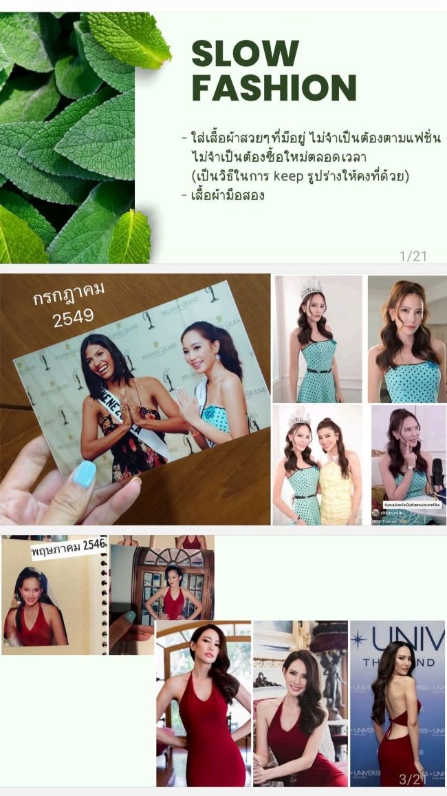 คุณฌาร์ม โอสถานนท์ Miss Universe Thailand 2006 ได้พูดคุยเกี่ยวกับประสบการณ์เป็นกระบอกเสียงด้านสิ่งแวดล้อมในด้านต่าง ๆ เช่น การเป็นส่วนหนึ่งของกิจกรรมรักษ์โลกที่จัดโดยหน่วยงานรัฐและเอกชน การเข้าร่วมโครงการปลูกป่า ปลูกปะการัง การใช้ถุงผ้าและการจัดถุงผ้าเป็นส่วนหนึ่งในของฝากเวลาเยี่ยมชมหรือพบผู้คนในโอกาสต่าง ๆ นอกจากนี้ ยังเผยอีกว่าชอบการช้อปปิ้งเสื้อผ้ามือสองมาก และได้ยกตัวอย่างการนำเสื้อผ้าเก่าเมื่อ 10 กว่าปีที่แล้วกลับมาใส่ใหม่ เช่น การนำชุดที่เคยใส่ในงานโรงเรียนช่วงเกรด 10 กลับมาใส่ใหม่ไปร่วมกิจกรรม Miss Universe Thailand 2025 นอกจากเป็นการลดมลพิษจากการย้อมสีหรืออุตสาหกรรมฟอกย้อมแล้ว ยังเป็นแรงบันดาลใจในการออกกำลังกายเพื่อรักษารูปร่างอยู่เสมอ
