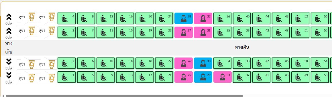 อยากได้ที่นั่งดีดี เริ่มที่ตู้อ้วน กซข.ป64 หมายเหตุ : ที่นั่งสีม่วงอ่อน หมายถึง ที่นั่งที่อยู่ตรงกลางหน้าต่าง ที่นั่งสีม่วงเข้ม หมายถึง ที่นั่งที่อยู่ตรงที่คั่นระหว่างหน้าต่าง ตู้ผอม กซข.ป76 ตู้ผ