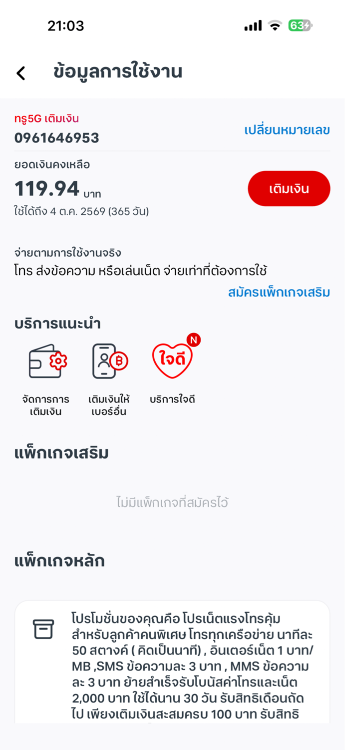 คือเราจะมีโทรศัพท์อยู่เครื่องนึงเติมเงินไว้ตลอด และสมัครเน็ตไว้ เดือนละ 100 บาท แบบหักเงินอัตโนมัติ วันที่ 04/08/68 มียอดเงินในโทรศัพท์ 600 บาท ที่เราเติมไว้เพราะ โทรศัพท์เครื่องนี้จะเอาไว้เปิดเพลงอย่