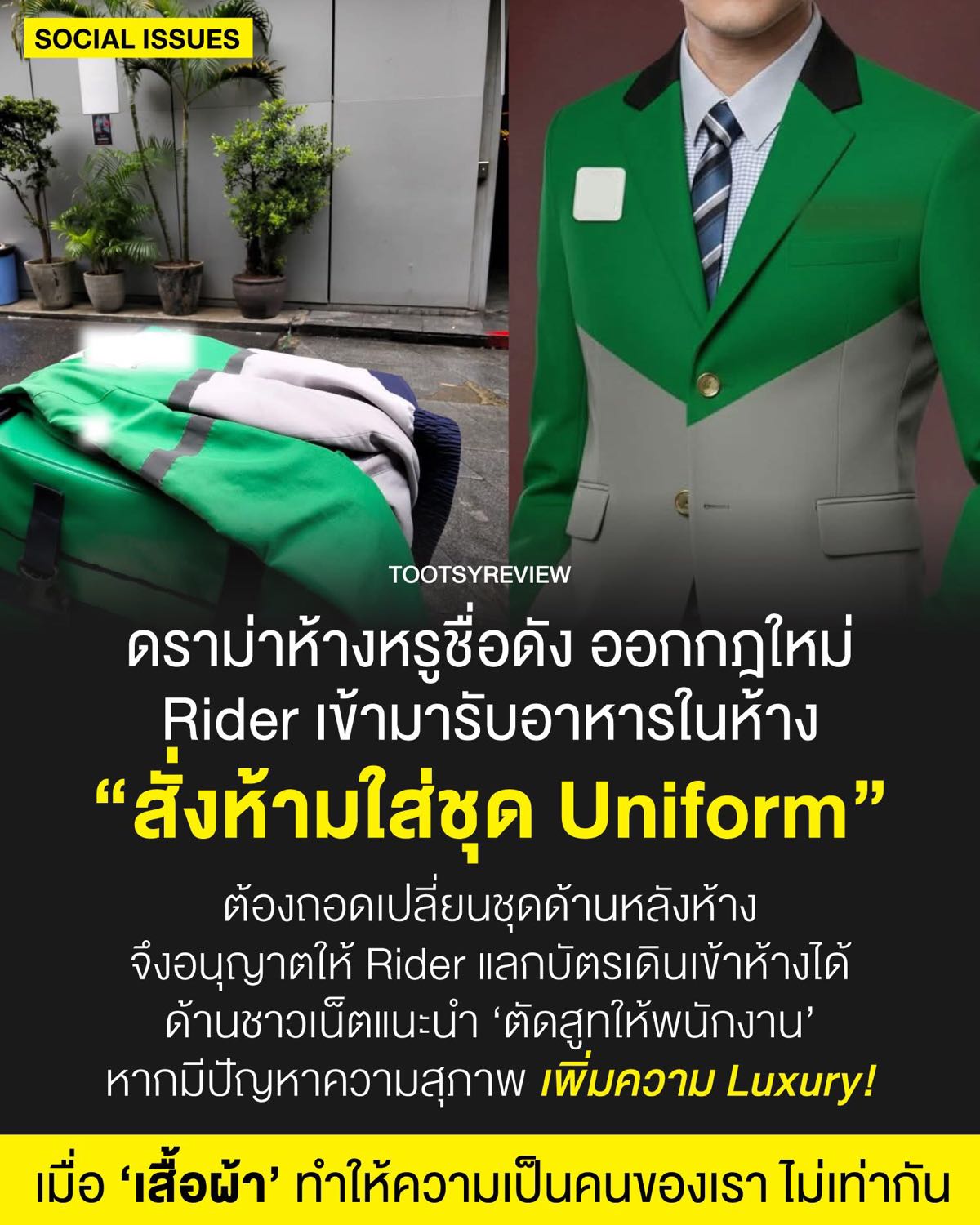 1) ล่าสุดในกลุ่ม Rider ของแบรนด์หนึ่ง มี Post ว่า "ตั้งแต่ 1 ตุลาคมนี้เป็นต้นไป ห้าม Rider ทุกคนเดินเข้าห้างไปรับอาหาร ด้วยการใส่ชุด Uniform" ซึ่งจริงๆ ก็คือ Rider ทุกเจ้าแหละครับ โดยกฎใหม่นี้ ทางห้างขอความร่วมมือให้เดินเข้ามาทางประตูด้านหลังห้าง โดยถอดเสื้อตัวนอก เปลี่ยนชุดก่อน แล้วค่อยแลกบัตรเข้าห้าง จึงจะได้รับอนุญาต
