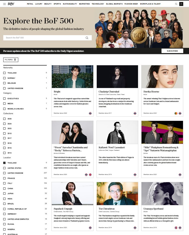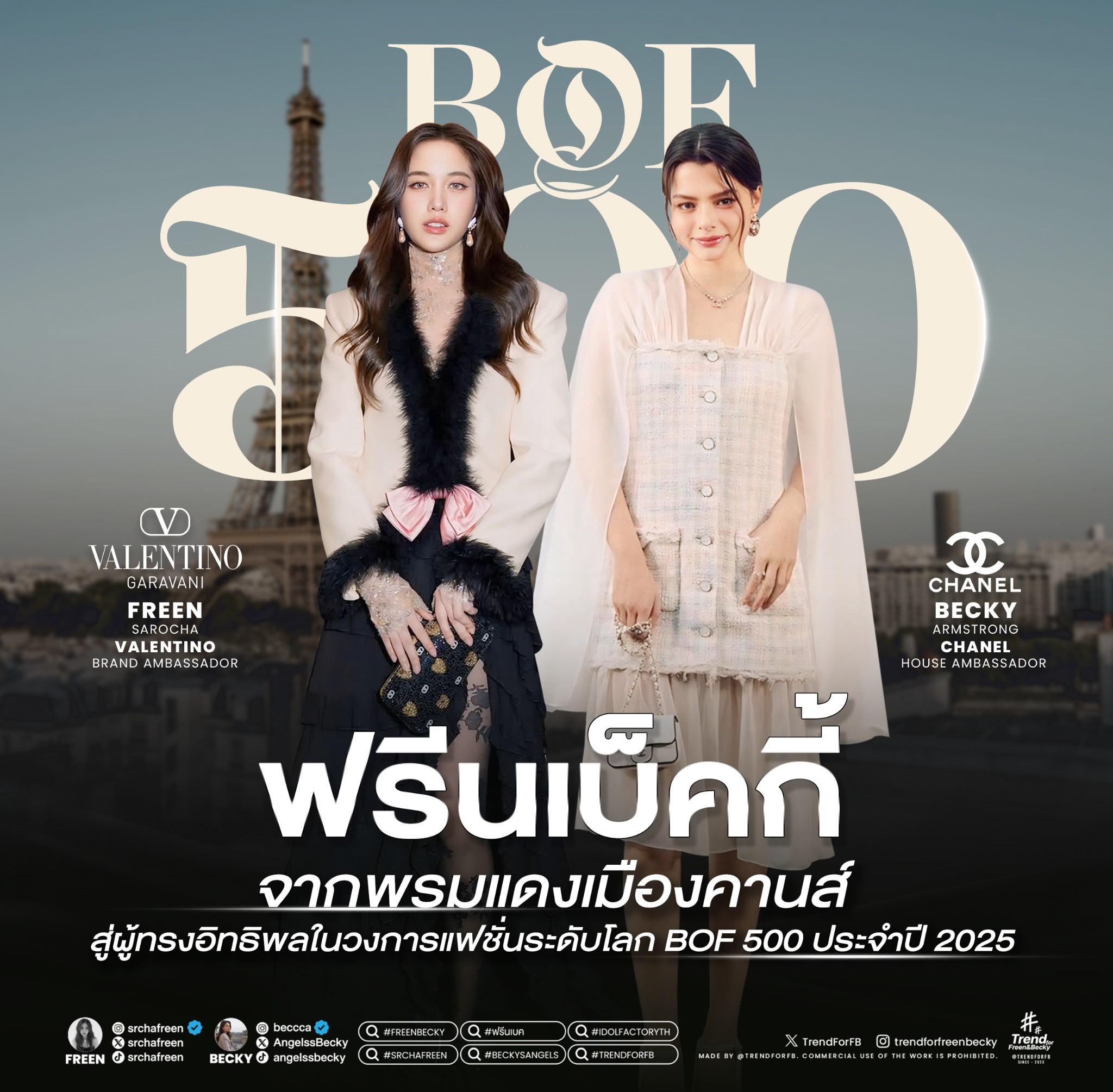 ได้มีการประกาศออกมาแล้วสำหรับรายชื่อในโผผู้ทรงอิทธิพลในวงการแฟชั่นระดับโลก BoF 500 จาก The Business of Fashion ประจำปี 2025 ซึ่งในปีนี้ 2 นักแสดงสาวชาวไทย ฟรีน - สโรชา จันทร์กิมฮะ และ เบ็คกี้ - รีเบคก้า แพทรีเซีย อาร์มสตรอง ได้ติดอันดับอยู่ในลิสต์อันทรงเกียรตินี้ด้วย