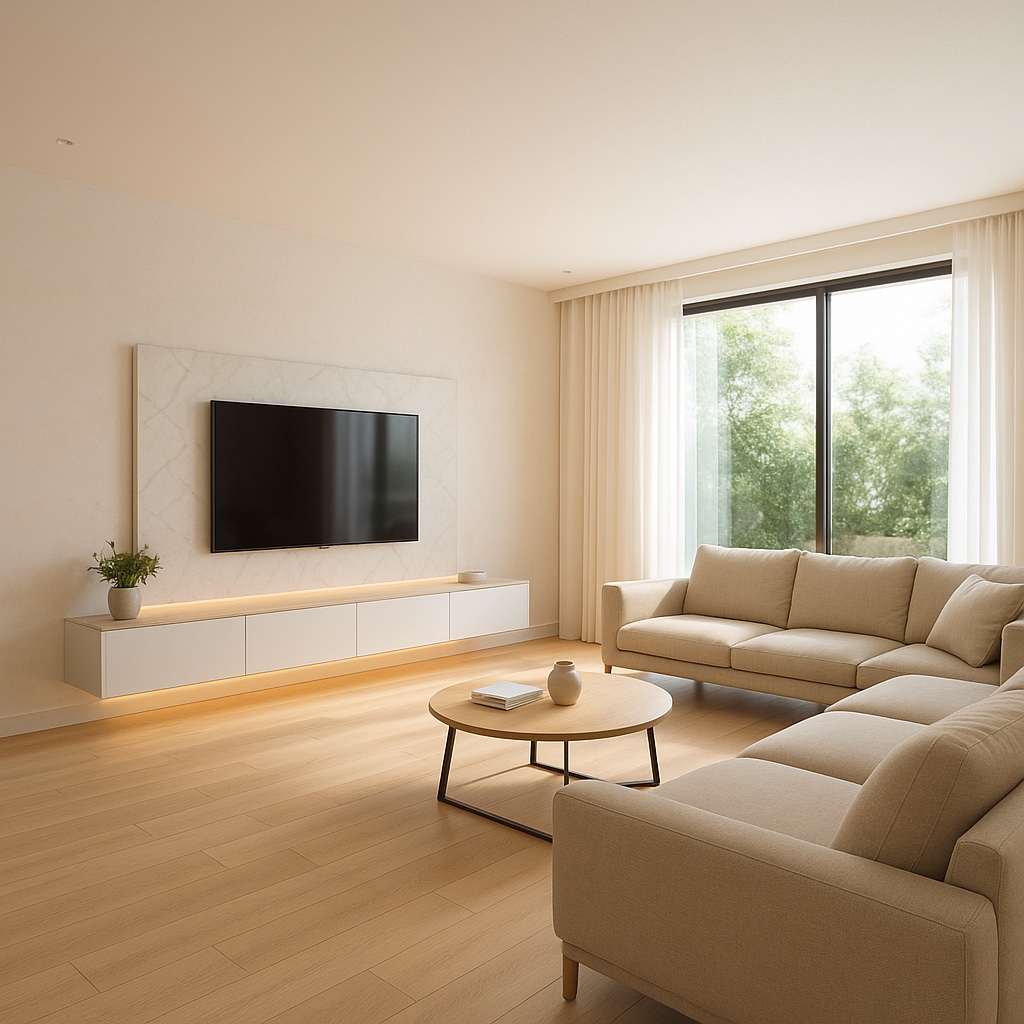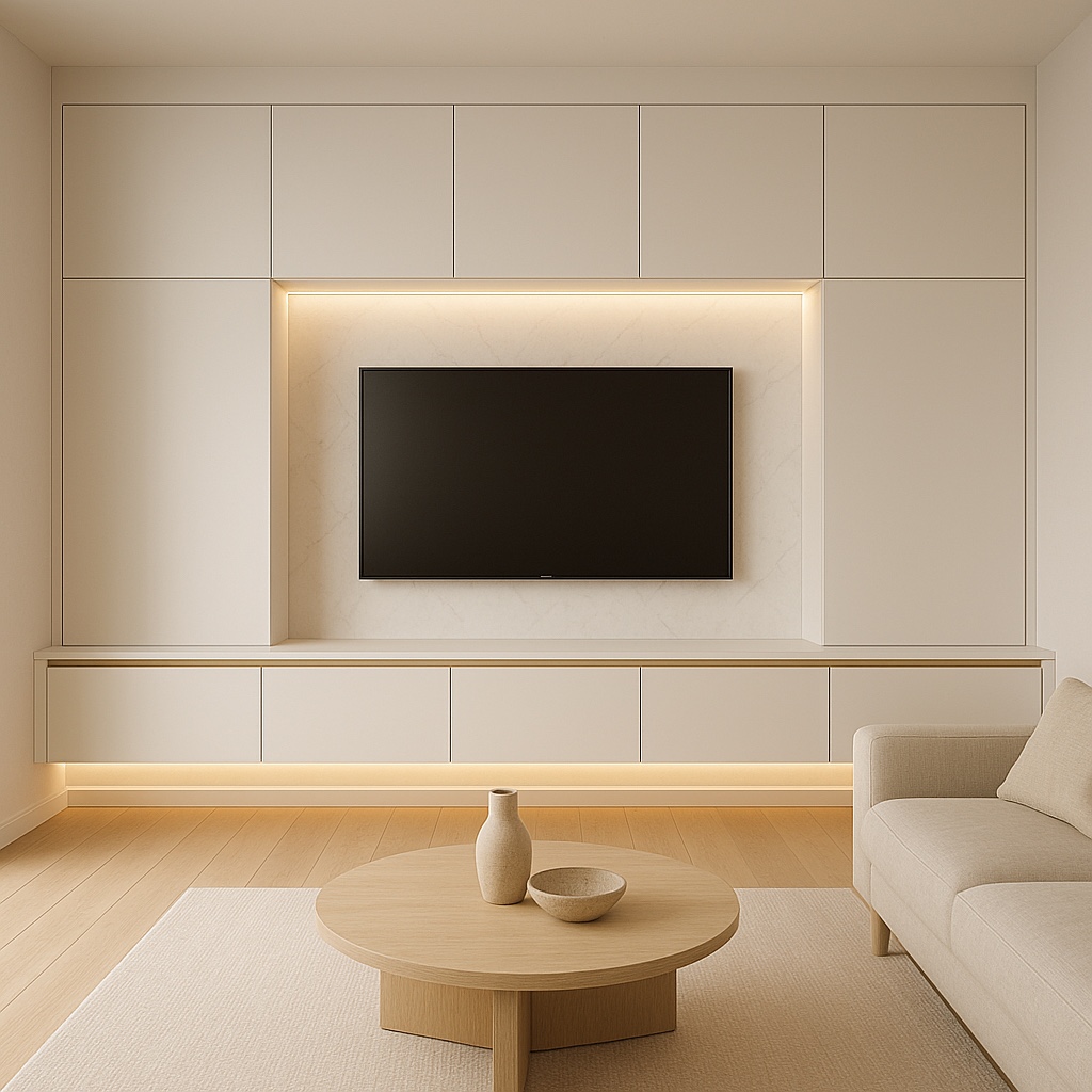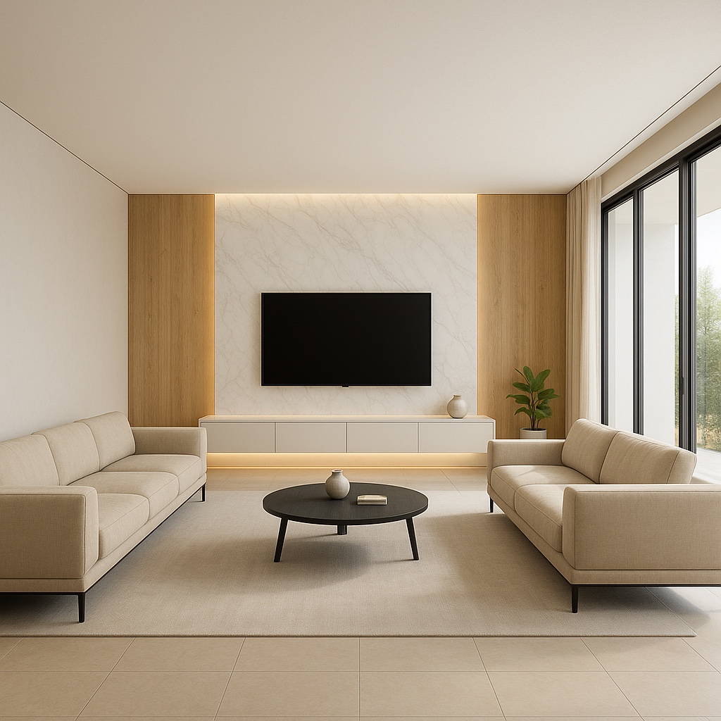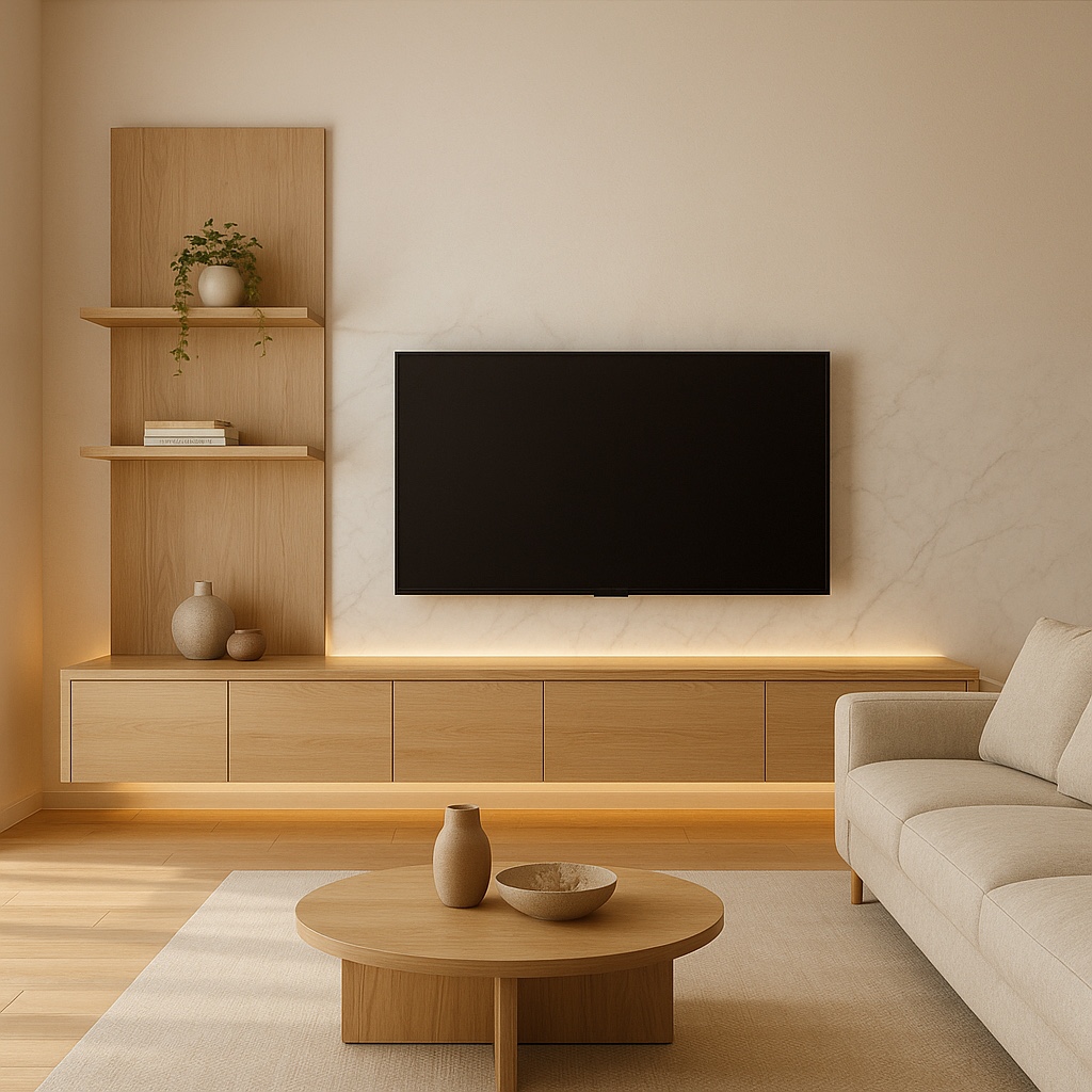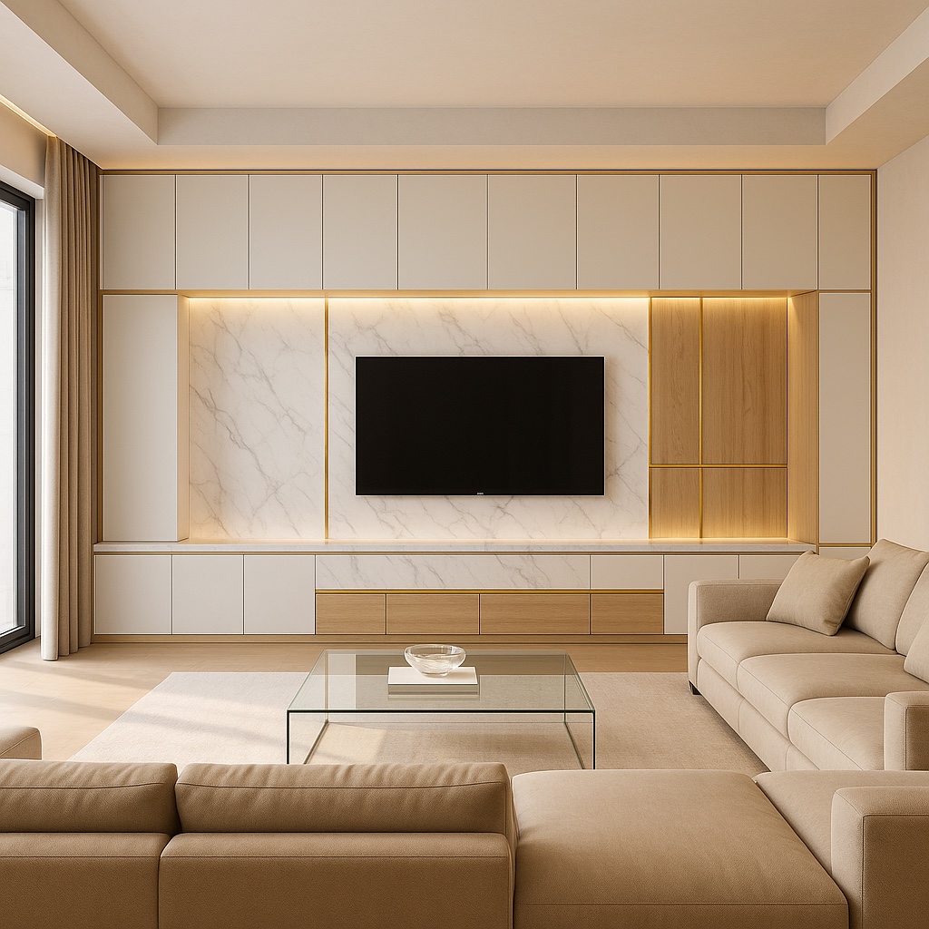 ผนังทีวีแนวใหม่ที่ใช้วัสดุหลายแบบ — ทั้ง ไม้ หินอ่อน กระจก และแผ่นสีด้าน (Matte Panel)