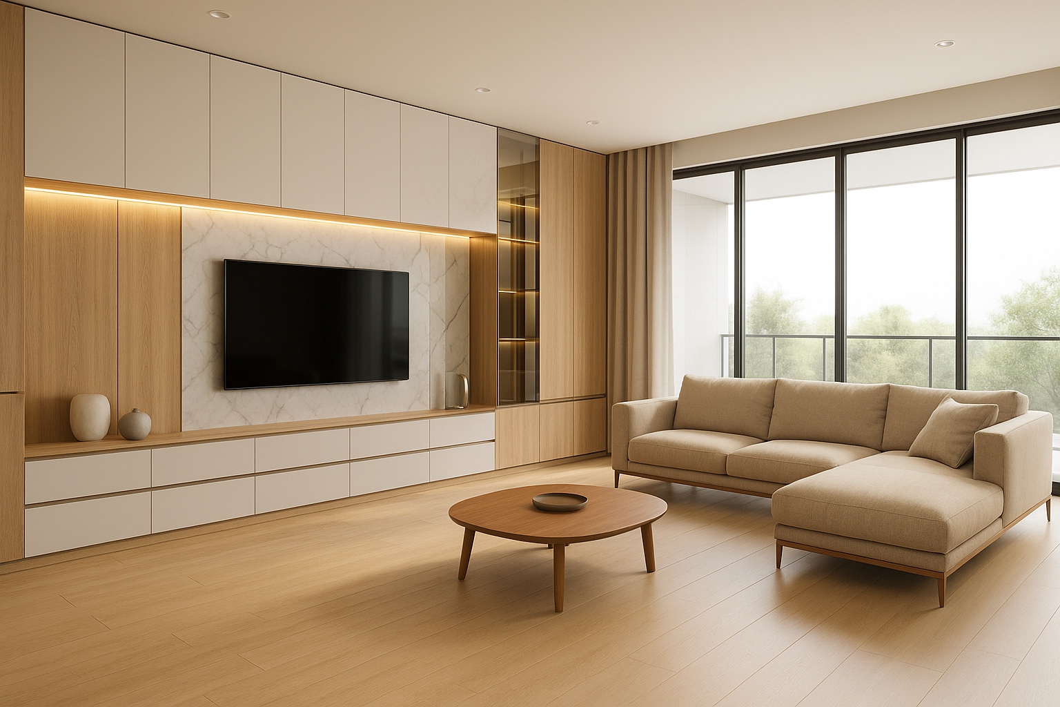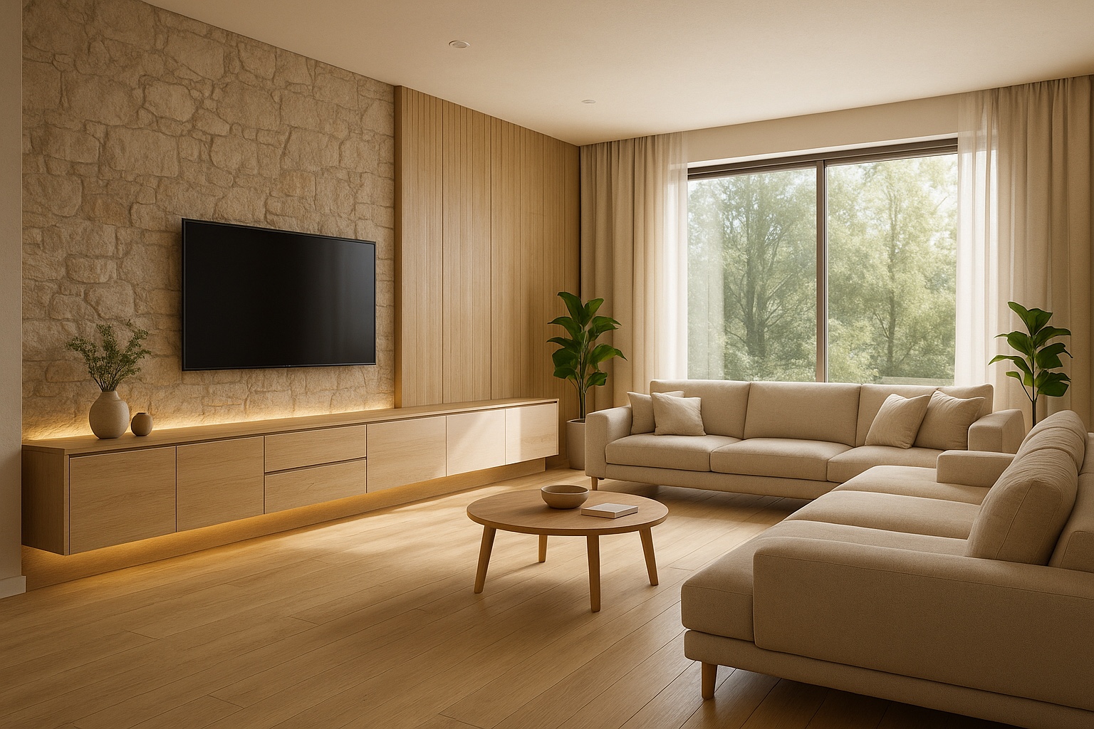 ผนังทีวีเป็นจุดเด่น ใช้วัสดุ ไม้โอ๊คอ่อน ผสมกับ หินธรรมชาติสีเบจ และซ่อนไฟ LED แบบ soft light ทำให้มุมนี้ดูอบอุ่นและมีมิติขึ้นมาก