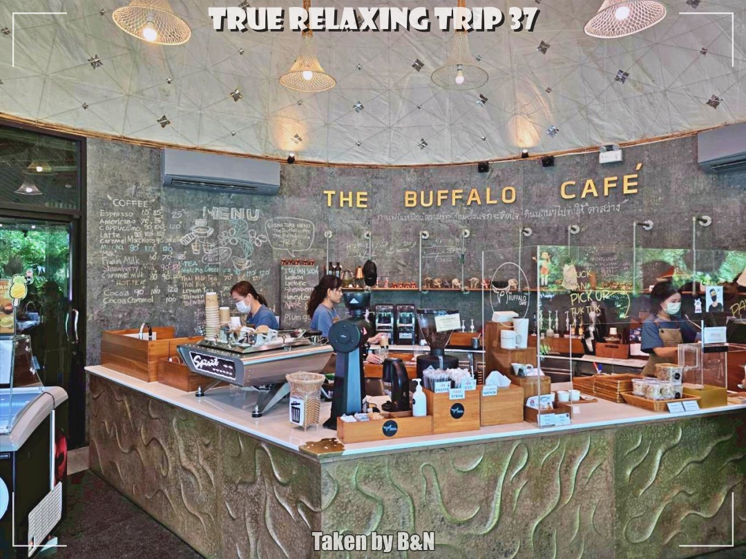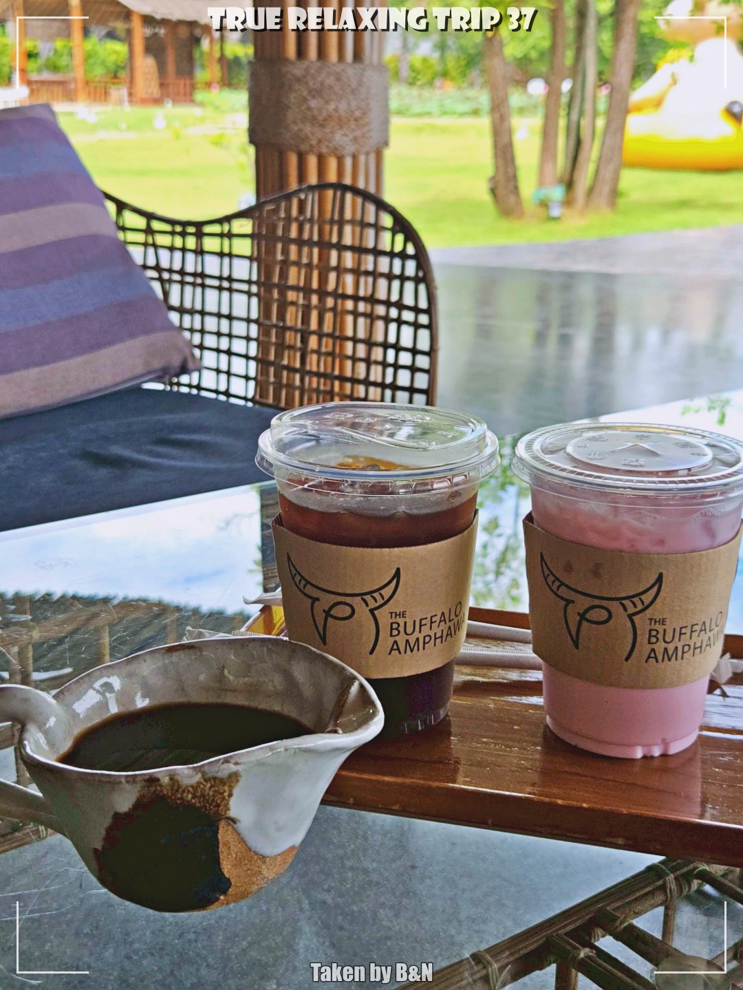 วันเดินทางนัดกันที่คาเฟ่ The Buffalo Café ตอน 10 โมงเพื่อหาขนม หากาแฟ หาน้ำหวานเติมพลังยามเช้า ราคาที่นี่ก็ไม่แพงมาก ร้านกว้างใหญ่ สวยงาม มีมุมถ่ายรูปเพียบ ติดแม่น้ำ เสียดายวันที่ไปร้อนมาก ร้อนแบบไร้ลม มีแต่แดดเปรี้ยงๆ ส่วนที่ติดแอร์มีที่นั่งน้อย เลยไม่ค่อยได้ถ่ายรูปเท่าที่ควร วันที่ไปเจอควาย 3 ตัว เป็นผู้ใหญ่ 2 และ Baby ควาย 1 ตัว นอนโคลนสบายใจฉ่ำ