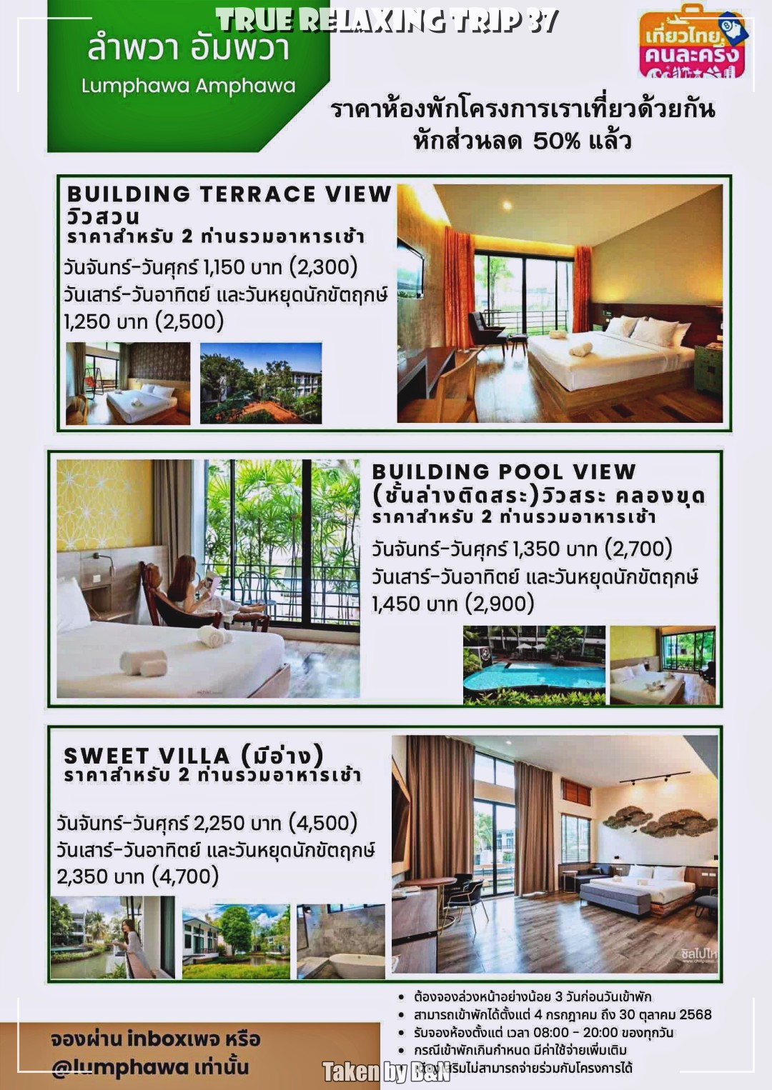ทริปนี้เกิดขึ้นมาได้ด้วยนโยบายคนละครึ่งของรัฐบาล ด้วยความเป็นคนที่เข้าร่วมทุกโครงการ ดังนั้นเราจะพลาดไม่ได้ อยากเที่ยวครอบครัวใกล้ๆ ไม่ไกลมาก เพราะมีผู้สูงอายุไปด้วย หาไปหามาเลยมาได้ที่ Lumphawa Amphawa Resort โดยห้องที่เข้าร่วมโครงการจะมี 3 แบบ จองเป็นห้องวิวสวน 3 ห้อง ราคา 2,500 บาท (จ่ายไป 1,250 บาท) และห้องติดสระ 3 ห้อง ราคา 2,900 บาท (จ่ายไป 1,450 บาท) รวมอาหารเช้า
