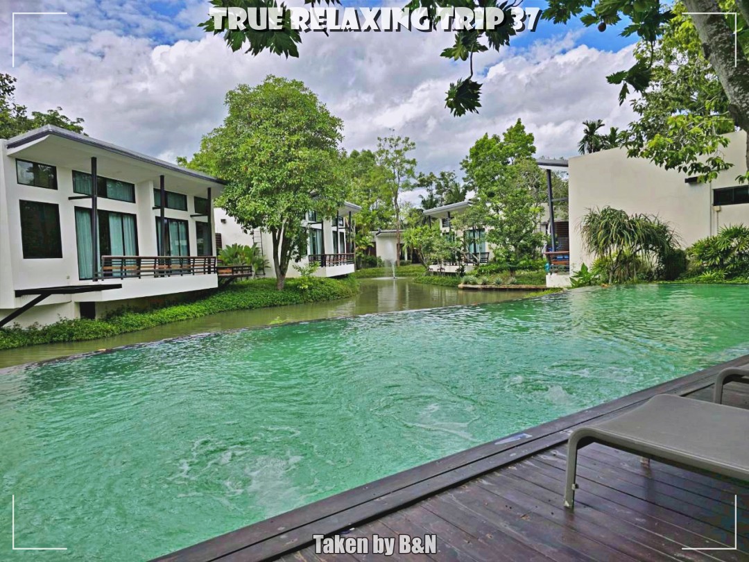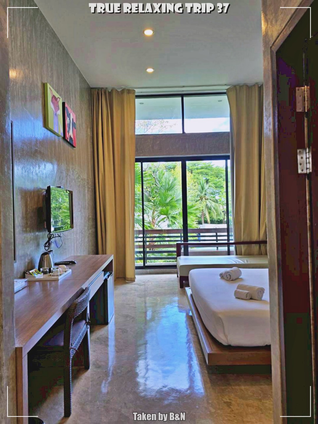 กินเสร็จก็เหนื่อยแล้ว เหนื่อยแดดเป็นหลัก ก็ได้เวลาพาผู้สูงอายุและเด็กๆกลับเข้าไปพักผ่อน เล่นน้ำในที่พัก ที่พักก็ไม่ได้ไกลจากร้านอาหาร ขับรถประมาณ 10 นาทีก็ถึง วันก่อนจะมาทางที่พักโทรมาแจ้งว่า เนื่องจากวันจองระบบรวน ที่พักเลยได้เป็นห้องวิวสวน 3 (ชั้นบน) ห้องติดสระ 1 และห้องวิลล่า 2 ห้อง มีประตูติดกัน สามารถเชื่อมถึงกันได้ คือเริ่ดเลย แถมติดสระด้วย (เค้าอัพเกรดที่พักให้เนื่องจากระบบรวน) ห้องที่ถ่ายมาจะเป็นห้องวิวสวน กลายเป็นห้องวิวสวนใหญ่สุดเลย กว้างขวาง ไวไฟดี เตียงดี หมอนนิ่มบางไปหน่อย ห้องน้ำดี น้ำแรง มีอุปกรณ์ให้พร้อม รวมๆคือให้คะแนนห้องเต็ม 10 เลย ที่พักก็กว้างขวาง ติดริมน้ำ มีบริการอาหารใส่บาตรยามเช้า (แต่ไม่ตื่น) โรงแรมเงียบสงบ สะอาดสะอ้าน ร่มรื่นใช้ได้เลย