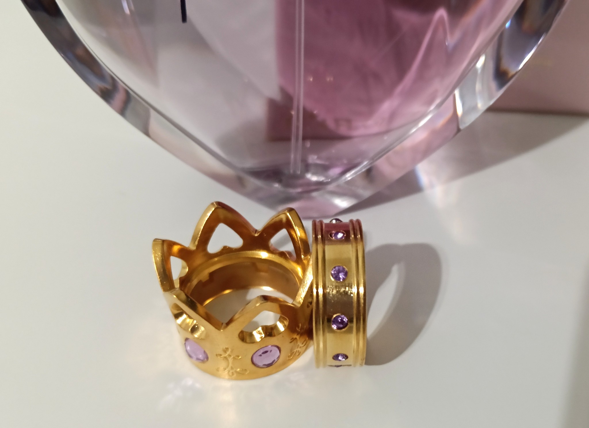 ขวดมีลักษณะเหมือนอัญมณีรูปหัวใจ สวยและสง่างาม เป็นสัญลักษณ์ของเสน่ห์อันมหัศจรรย์และความโรแมนติกในโทนสีม่วงอ่อน และพิเศษสุดๆ ตรงนี้เลยค่ะ มงกุฏและฐานถอดออกมาใส่เป็นแหวนได้